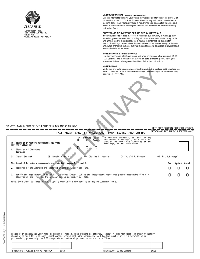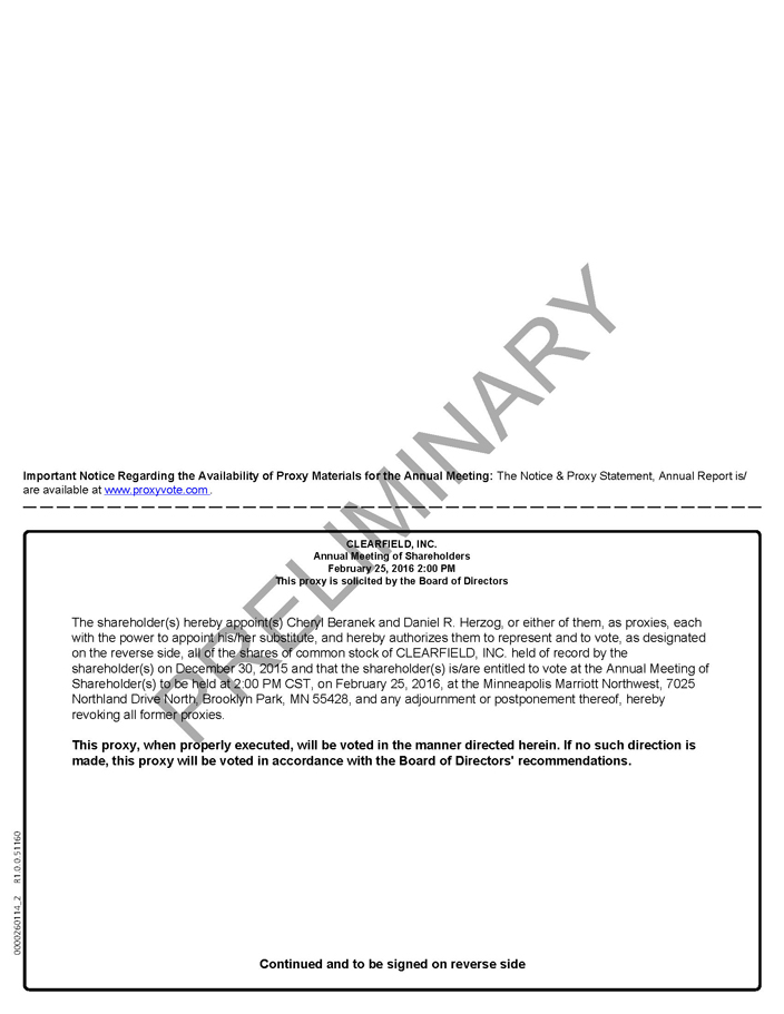Only holders of record of Clearfield, Inc.’s common stock at the close of business on [December 30, 2015] are entitled to notice of, and to vote at, the Annual Meeting.