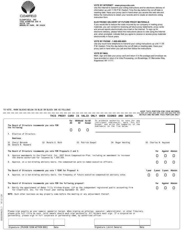 | 5. | Ratify the appointment of Baker Tilly Virchow Krause, LLP as the independent registered public accounting firm for Clearfield, Inc. for the fiscal year ending September 30, 2017. |