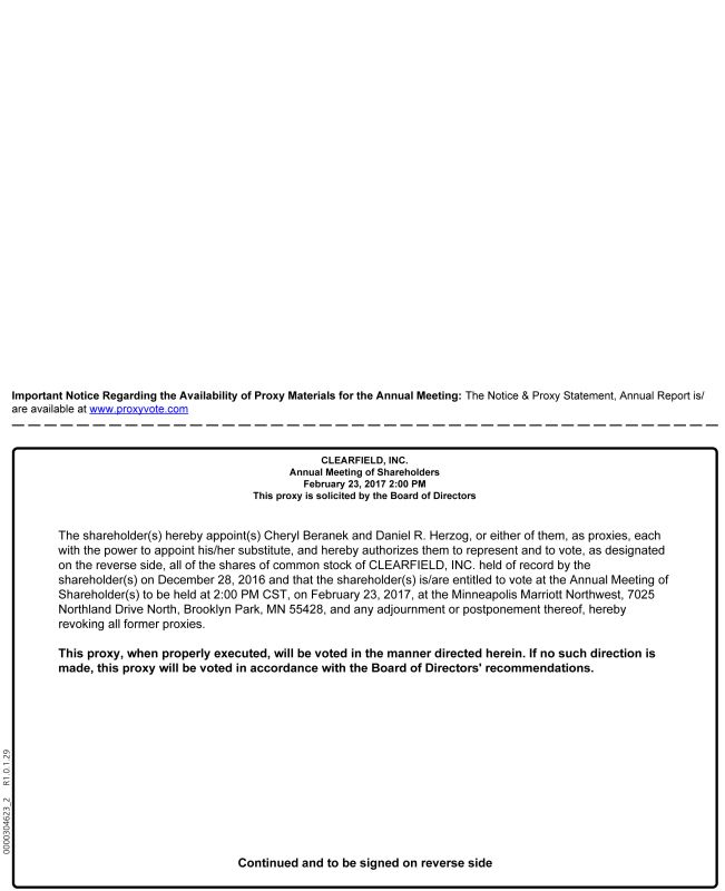 NOTICE IS HEREBY GIVEN that the Annual Meeting of Shareholders of Clearfield, Inc., a Minnesota corporation, will be held on Thursday, February 23, 2017, at 2:00 p.m. (local time), at the Minneapolis Marriott Northwest, 7025 Northland Drive North, Brooklyn Park, MN 55428 for the following purposes:
