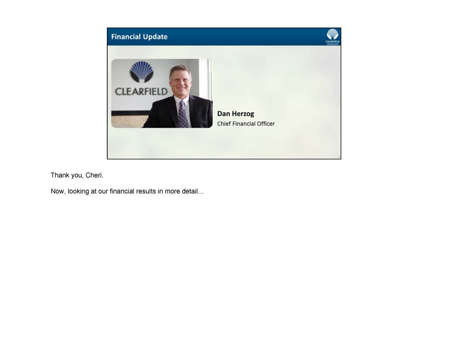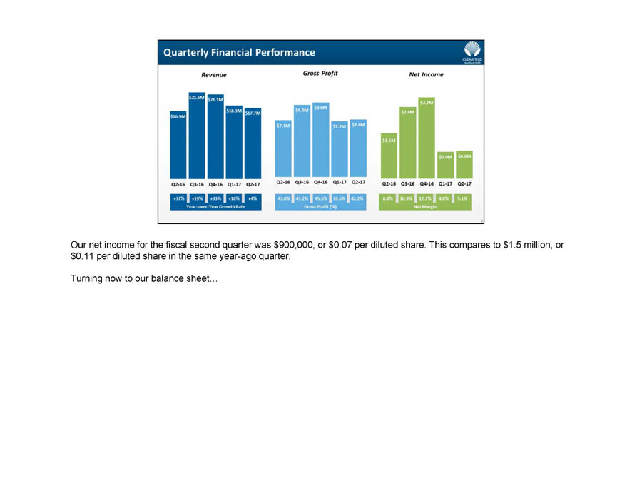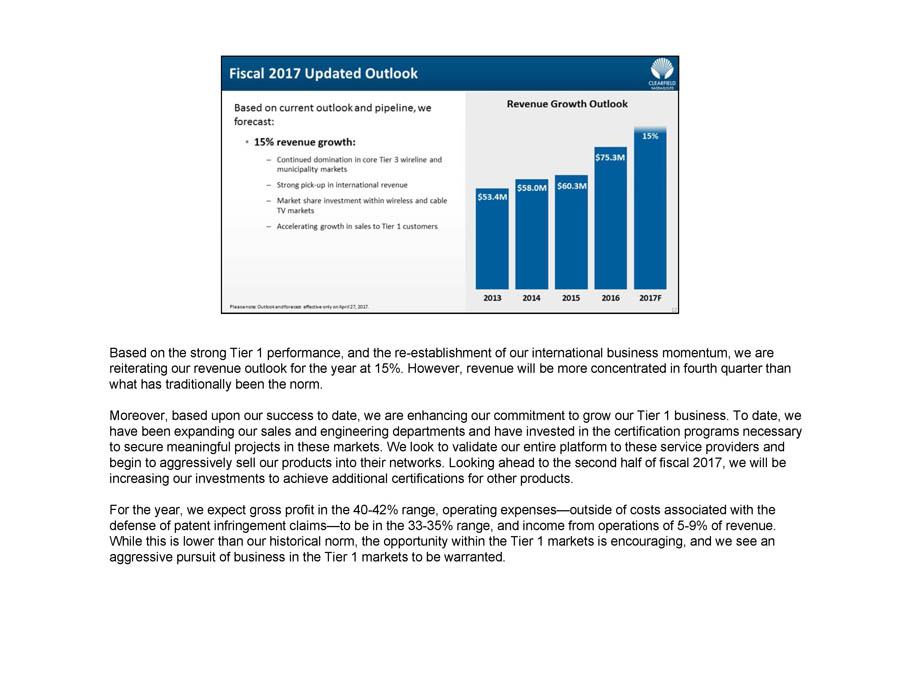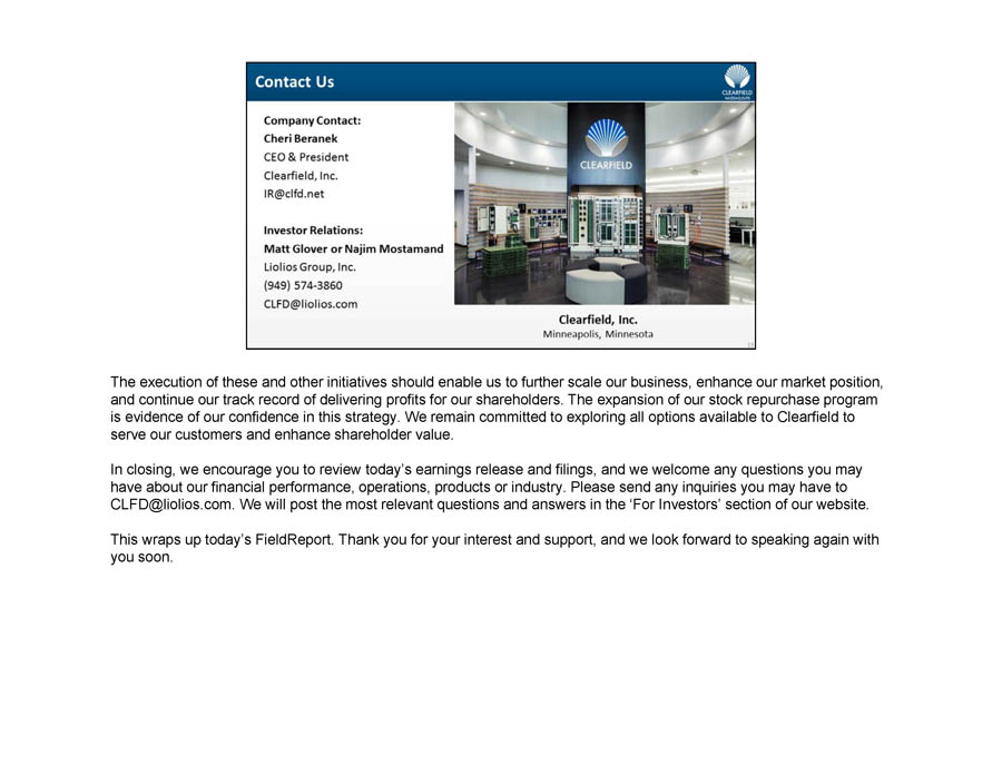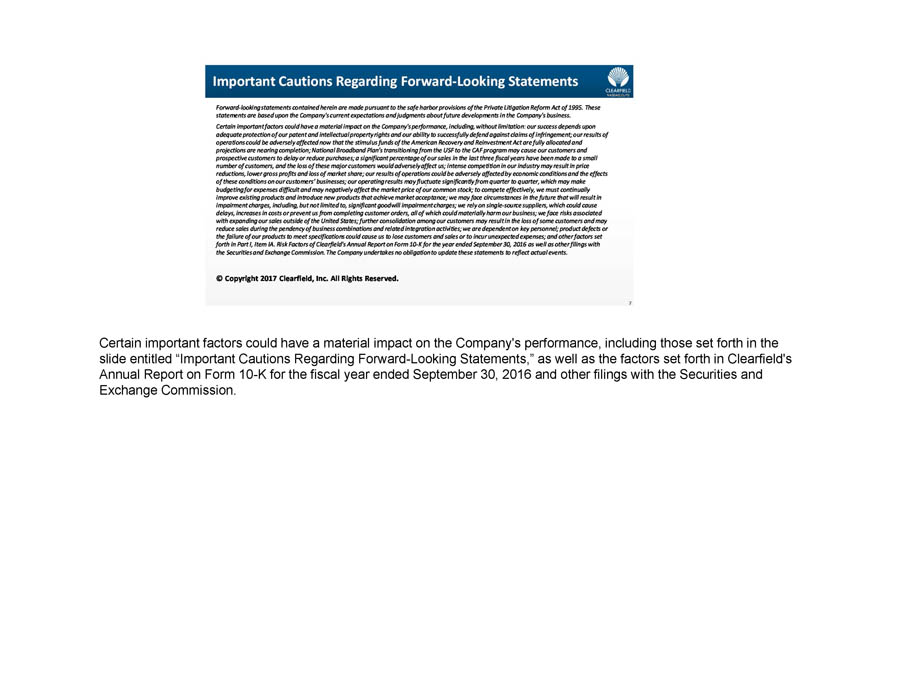 Certain important factors could have a material impact on the Company's performance, including those set forth in the slide entitled “Important Cautions Regarding Forward - Looking Statements,” as well as the factors set forth in Clearfield's Annual Report on Form 10 - K for the fiscal year ended September 30, 2016 and other filings with the Securities and Exchange Commission.