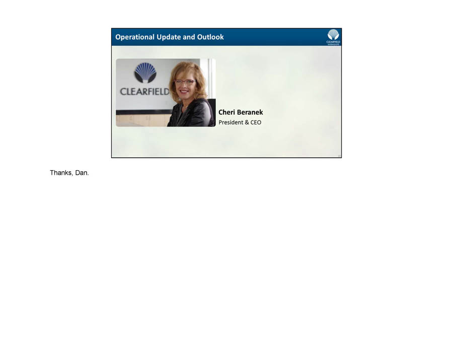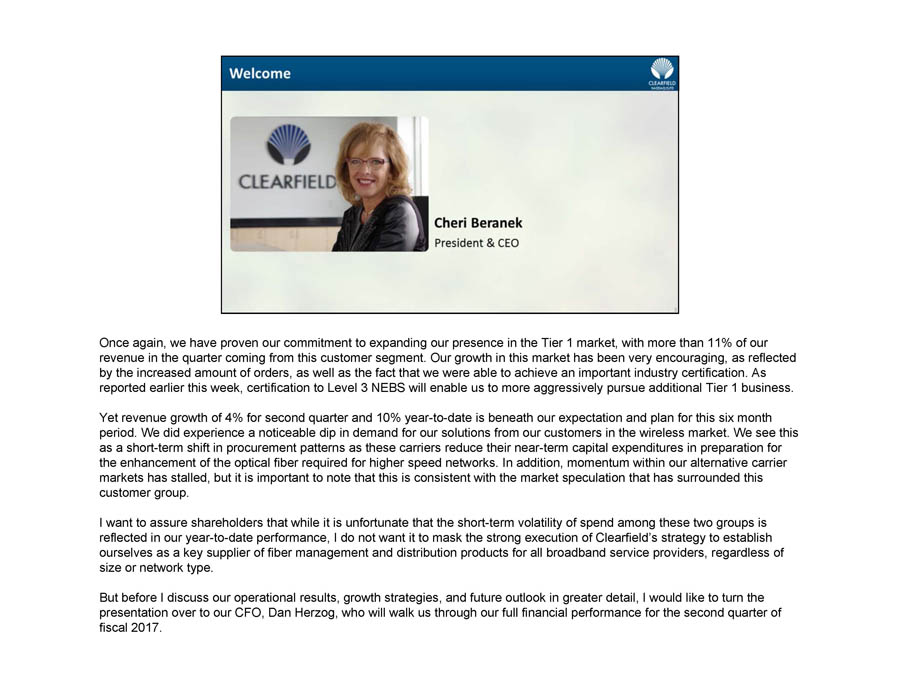 Hello, this is Cheri Beranek, President and CEO of Clearfield. Welcome to our fiscal second quarter 2017 FieldReport. Before we begin today, I’d like to provide some important cautions regarding forward - looking statements made during today’s presentation.