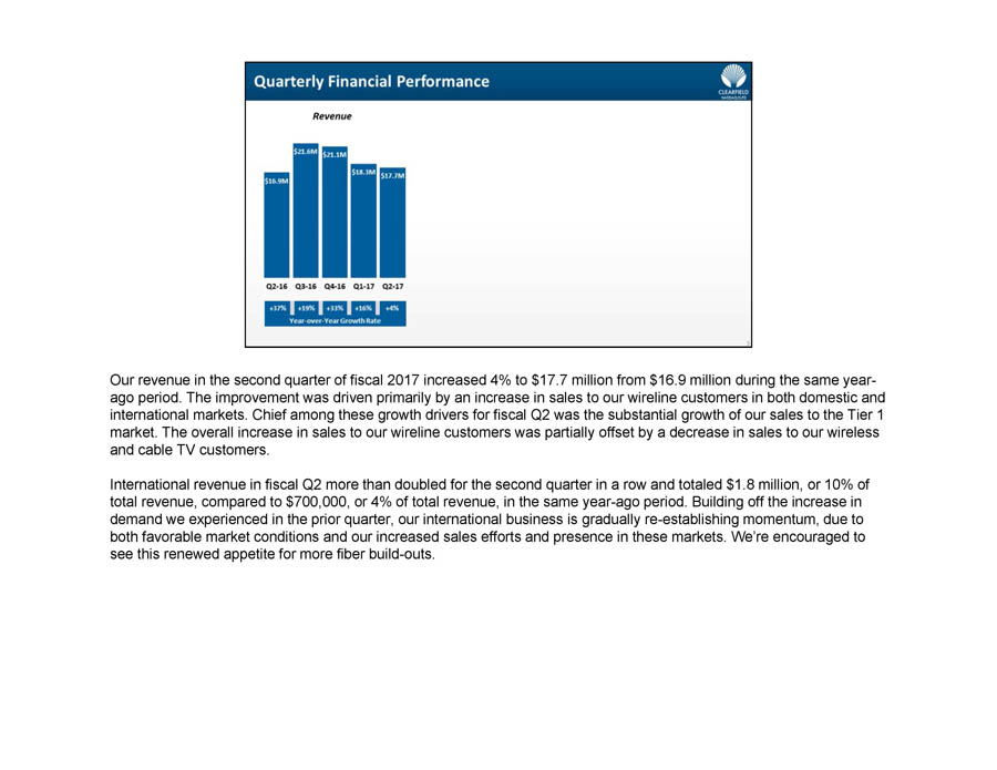 Our revenue in the second quarter of fiscal 2017 increased 4% to $17.7 million from $16.9 million during the same year - ago period. The improvement was driven primarily by an increase in sales to our wireline customers in both domestic and international markets. Chief among these growth drivers for fiscal Q2 was the substantial growth of our sales to the Tier 1 market. The overall increase in sales to our wireline customers was partially offset by a decrease in sales to our wireless and cable TV customers. International revenue in fiscal Q2 more than doubled for the second quarter in a row and totaled $1.8 million, or 10% of total revenue, compared to $700,000, or 4% of total revenue, in the same year - ago period. Building off the increase in demand we experienced in the prior quarter, our international business is gradually re - establishing momentum, due to both favorable market conditions and our increased sales efforts and presence in these markets. We’re encouraged to see this renewed appetite for more fiber build - outs.