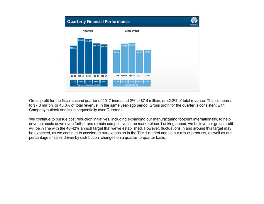 Gross profit for the fiscal second quarter of 2017 increased 2% to $7.4 million, or 42.2% of total revenue. This compares to $7.3 million, or 43.0% of total revenue, in the same year - ago period. Gross profit for the quarter is consistent with Company outlook and is up sequentially over Quarter 1. We continue to pursue cost reduction initiatives, including expanding our manufacturing footprint internationally, to help drive our costs down even further and remain competitive in the marketplace. Looking ahead, we believe our gross profit will be in line with the 40 - 42% annual target that we’ve established. However, fluctuations in and around this target may be expected, as we continue to accelerate our expansion in the Tier 1 market and as our mix of products, as well as our percentage of sales driven by distribution, changes on a quarter - to - quarter basis.