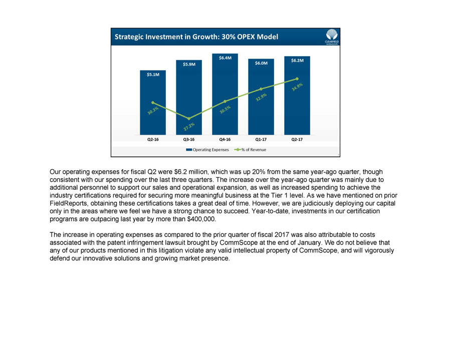 Our operating expenses for fiscal Q2 were $6.2 million, which was up 20% from the same year - ago quarter, though consistent with our spending over the last three quarters. The increase over the year - ago quarter was mainly due to additional personnel to support our sales and operational expansion, as well as increased spending to achieve the industry certifications required for securing more meaningful business at the Tier 1 level. As we have mentioned on prior FieldReports, obtaining these certifications takes a great deal of time. However, we are judiciously deploying our capital only in the areas where we feel we have a strong chance to succeed. Year - to - date, investments in our certification programs are outpacing last year by more than $400,000. The increase in operating expenses as compared to the prior quarter of fiscal 2017 was also attributable to costs associated with the patent infringement lawsuit brought by CommScope at the end of January. We do not believe that any of our products mentioned in this litigation violate any valid intellectual property of CommScope, and will vigorously defend our innovative solutions and growing market presence.
