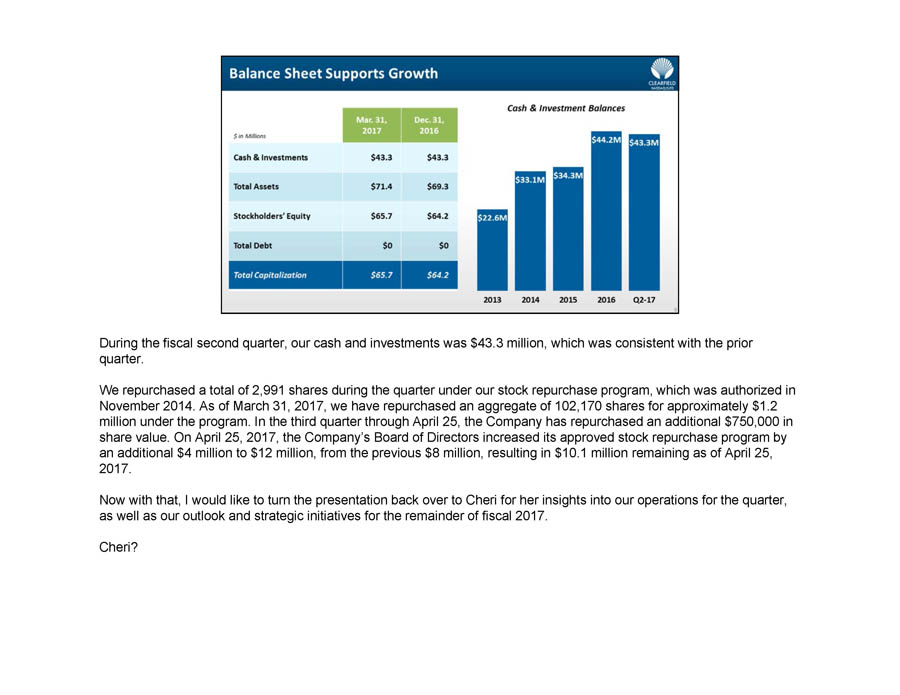 During the fiscal second quarter, our cash and investments was $43.3 million, which was consistent with the prior quarter. We repurchased a total of 2,991 shares during the quarter under our stock repurchase program, which was authorized in November 2014. As of March 31, 2017, we have repurchased an aggregate of 102,170 shares for approximately $1.2 million under the program. In the third quarter through April 25, the Company has repurchased an additional $750,000 in share value. On April 25, 2017, the Company’s Board of Directors increased its approved stock repurchase program by an additional $4 million to $12 million, from the previous $8 million, resulting in $10.1 million remaining as of April 25, 2017. Now with that, I would like to turn the presentation back over to Cheri for her insights into our operations for the quarter, as well as our outlook and strategic initiatives for the remainder of fiscal 2017. Cheri?