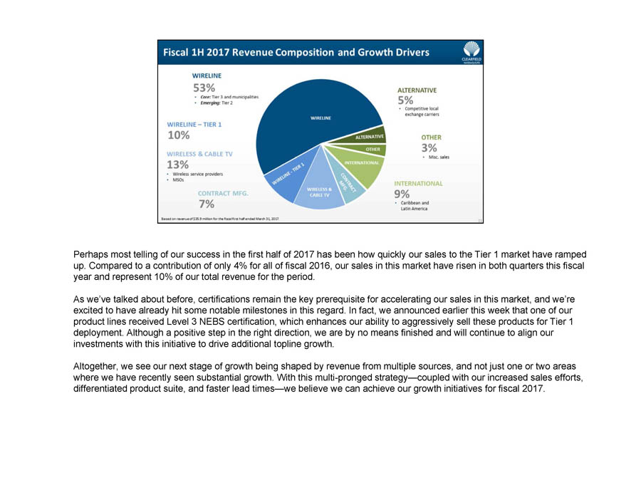 Once again, we have proven our commitment to expanding our presence in the Tier 1 market, with more than 11% of our revenue in the quarter coming from this customer segment. Our growth in this market has been very encouraging, as reflected by the increased amount of orders, as well as the fact that we were able to achieve an important industry certification. As reported earlier this week, certification to Level 3 NEBS will enable us to more aggressively pursue additional Tier 1 business. Yet revenue growth of 4% for second quarter and 10% year - to - date is beneath our expectation and plan for this six month period. We did experience a noticeable dip in demand for our solutions from our customers in the wireless market. We see this as a short - term shift in procurement patterns as these carriers reduce their near - term capital expenditures in preparation for the enhancement of the optical fiber required for higher speed networks. In addition, momentum within our alternative carrier markets has stalled, but it is important to note that this is consistent with the market speculation that has surrounded this customer group. I want to assure shareholders that while it is unfortunate that the short - term volatility of spend among these two groups is reflected in our year - to - date performance, I do not want it to mask the strong execution of Clearfield’s strategy to establish ourselves as a key supplier of fiber management and distribution products for all broadband service providers, regardless of size or network type. But before I discuss our operational results, growth strategies, and future outlook in greater detail, I would like to turn the presentation over to our CFO, Dan Herzog, who will walk us through our full financial performance for the second quarter of fiscal 2017.