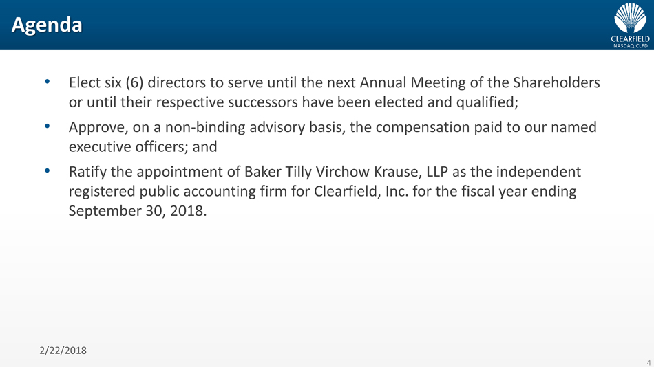 NASDAQ:CLFD Call to Order This meeting was called by a notice and proxy statement first mailed on January 9, 2018 to all shareholders of record on December 27, 2017 We have received proxies representing more than a majority of the outstanding shares of common stock. Therefore, this meeting has been duly called and a quorum is present. 3 2/22/2018