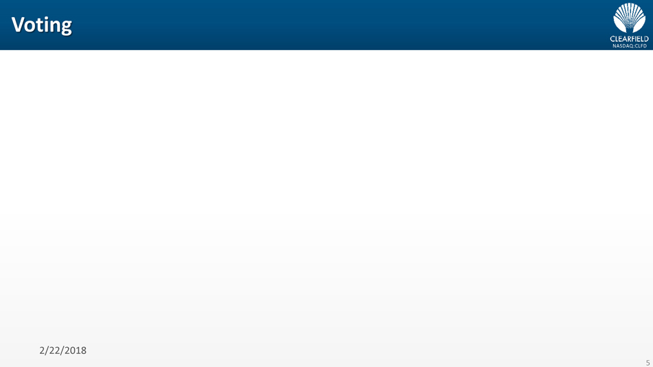 NASDAQ:CLFD Agenda • Elect six (6) directors to serve until the next Annual Meeting of the Shareholders or until their respective successors have been elected and qualified; • Approve, on a non - binding advisory basis, the compensation paid to our named executive officers; and • Ratify the appointment of Baker Tilly Virchow Krause, LLP as the independent registered public accounting firm for Clearfield, Inc. for the fiscal year ending September 30, 2018. 4 2/22/2018 CB4