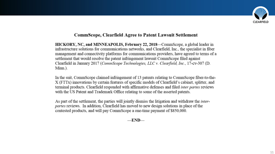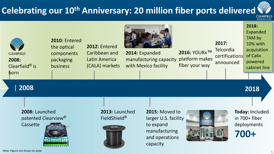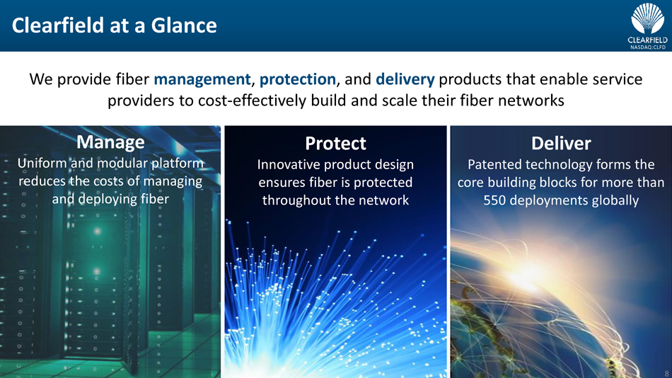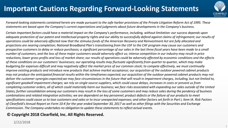 NASDAQ:CLFD Important Cautions Regarding Forward - Looking Statements Forward - looking statements contained herein are made pursuant to the safe harbor provisions of the Private Litigation Reform Act of 1995. These statements are based upon the Company's current expectations and judgments about future developments in the Company's busines s. Certain important factors could have a material impact on the Company's performance, including, without limitation: our succe ss depends upon adequate protection of our patent and intellectual property rights and our ability to successfully defend against claims of infringement; our results of operations could be adversely affected now that the stimulus funds of the American Recovery and Reinvestment Act are fully al loc ated and projections are nearing completion; National Broadband Plan’s transitioning from the USF to the CAF program may cause our cus tom ers and prospective customers to delay or reduce purchases; a significant percentage of our sales in the last three fiscal years have be en made to a small number of customers, and the loss of these major customers would adversely affect us; intense competition in our industry may re sult in price reductions, lower gross profits and loss of market share; our results of operations could be adversely affected by economic c ond itions and the effects of these conditions on our customers’ businesses; our operating results may fluctuate significantly from quarter to quarter, whi ch may make budgeting for expenses difficult and may negatively affect the market price of our common stock; to compete effectively, we m ust continually improve existing products and introduce new products that achieve market acceptance; our acquisition of the outdoor powered cabinet products may not produce the anticipated financial results within the timeframes expected; our acquisition of the outdoor powered cabinet products may not deliver the customer synergies expected; we may face circumstances in the future that will result in impairment charges, including, but not limited to, significant goodwill impairment charges; we rely on single - source suppliers, which could cause delays, increases in costs or pre vent us from completing customer orders, all of which could materially harm our business; we face risks associated with expanding our sale s o utside of the United States; further consolidation among our customers may result in the loss of some customers and may reduce sales during the pendency of busine ss combinations and related integration activities; we are dependent on key personnel; product defects or the failure of our pro duc ts to meet specifications could cause us to lose customers and sales or to incur unexpected expenses; and other factors set forth in Par t I , Item IA. Risk Factors of Clearfield's Annual Report on Form 10 - K for the year ended September 30, 2017 as well as other filings with the Securities and Exchange Commission. The Company undertakes no obligation to update these statements to reflect actual events. © Copyright 2018 Clearfield, Inc. All Rights Reserved. 7 2/22/2018 CB5