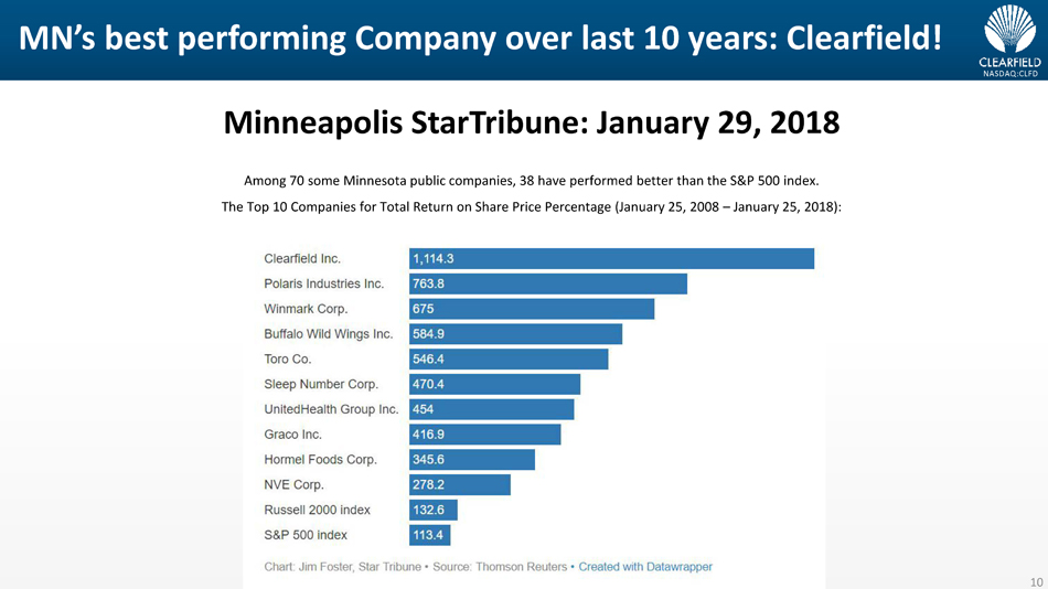 NASDAQ:CLFD MN’s best performing Company over last 10 years: Clearfield! Minneapolis StarTribune : January 29, 2018 Among 70 some Minnesota public companies, 38 have performed better than the S&P 500 index. The Top 10 Companies for Total Return on Share Price Percentage (January 25, 2008 – January 25, 2018): 10