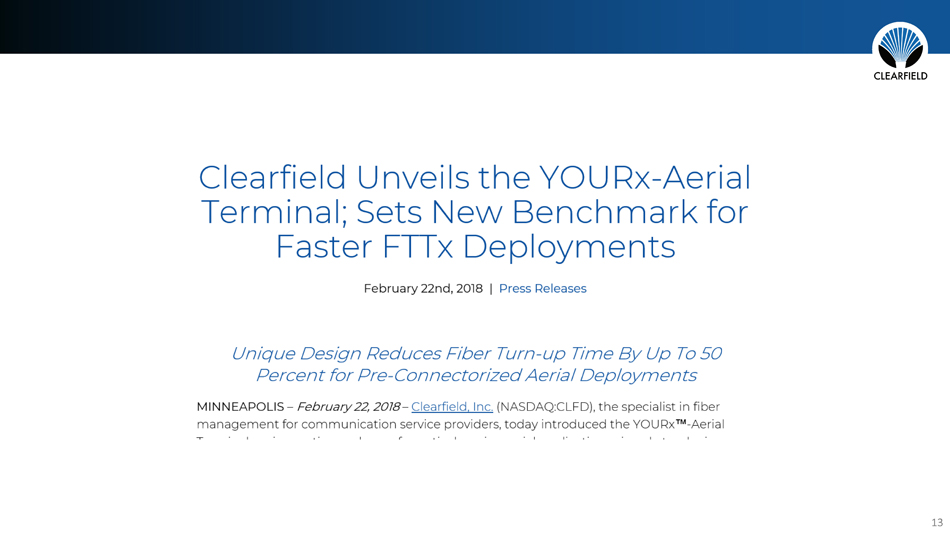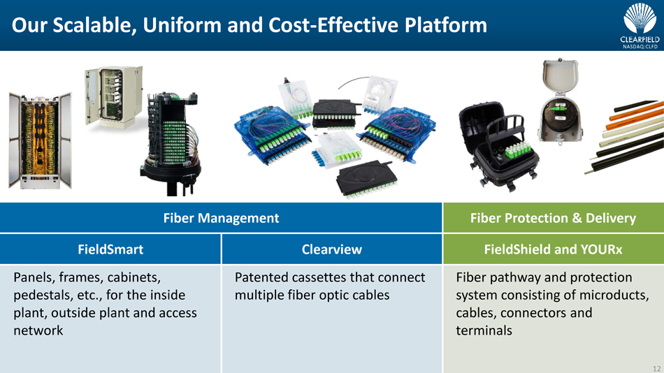 NASDAQ:CLFD Fiber Management Fiber Protection & Delivery FieldSmart Clearview FieldShield and YOURx Panels, frames, cabinets, pedestals, etc., for the inside plant, outside plant and access network Patented cassettes that connect multiple fiber optic cables Fiber pathway and protection system consisting of m icroducts, cables, connectors and terminals Our Scalable, Uniform and Cost - Effective Platform 12