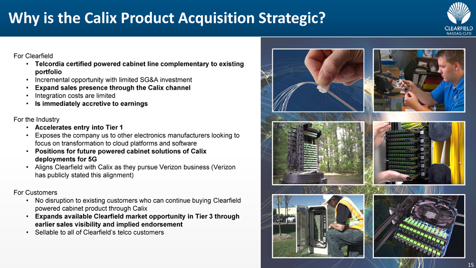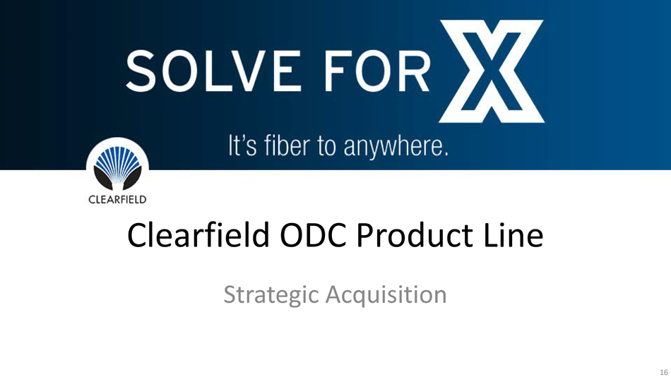 NASDAQ:CLFD Why is the Calix Product Acquisition Strategic? 15 For Clearfield • Telcordia certified powered cabinet line complementary to existing portfolio • Incremental opportunity with limited SG&A investment • Expand sales presence through the Calix channel • Integration costs are limited • Is immediately accretive to earnings For the Industry • Accelerates entry into Tier 1 • Exposes the company us to other electronics manufacturers looking to focus on transformation to cloud platforms and software • Positions for future powered cabinet solutions of Calix deployments for 5G • Aligns Clearfield with Calix as they pursue Verizon business (Verizon has publicly stated this alignment) For Customers • No disruption to existing customers who can continue buying Clearfield powered cabinet product through Calix • Expands available Clearfield market opportunity in Tier 3 through earlier sales visibility and implied endorsement • Sellable to all of Clearfield’s telco customers
