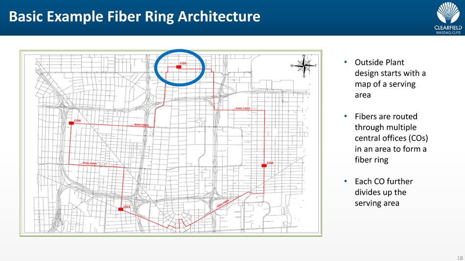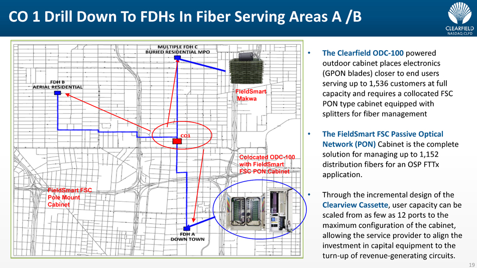 NASDAQ:CLFD • Outside Plant design starts with a map of a serving area • Fibers are routed through multiple central offices (COs) in an area to form a fiber ring • Each CO further divides up the serving area Basic Example Fiber Ring Architecture 18