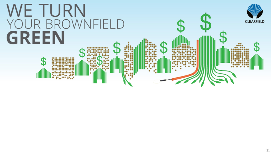 NASDAQ:CLFD • The Clearfield ODC - 100 powered outdoor cabinet places electronics (GPON blades) closer to end users serving up to 1,536 customers at full capacity and requires a collocated FSC PON type cabinet equipped with splitters for fiber management • The FieldSmart FSC Passive Optical Network (PON) Cabinet is the complete solution for managing up to 1,152 distribution fibers for an OSP FTTx application. • Through the incremental design of the Clearview Cassette , user capacity can be scaled from as few as 12 ports to the maximum configuration of the cabinet, allowing the service provider to align the investment in capital equipment to the turn - up of revenue - generating circuits. FieldSmart Makwa Colocated ODC - 100 with FieldSmart FSC PON Cabinet FieldSmart FSC Pole Mount Cabinet CO 1 Drill Down To FDHs In Fiber Serving Areas A / B 19