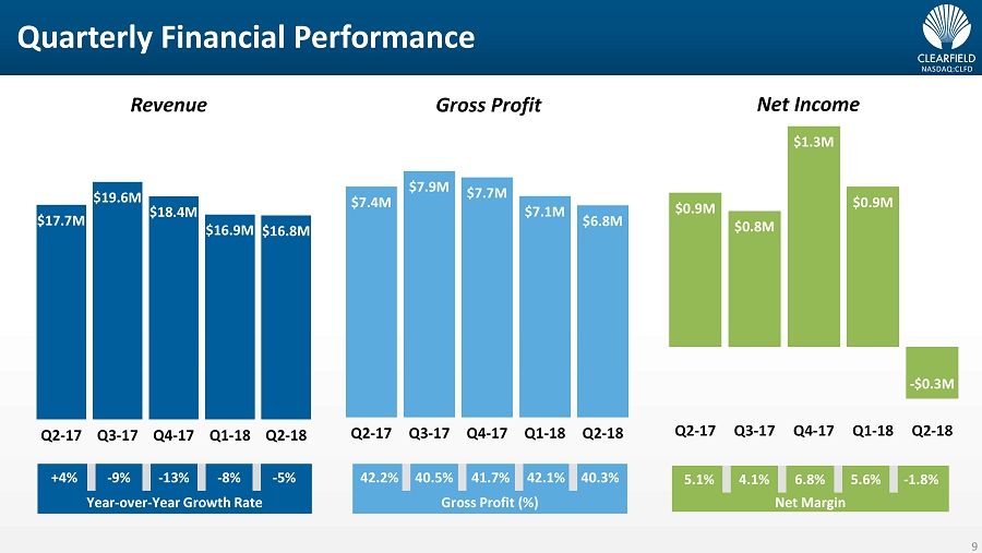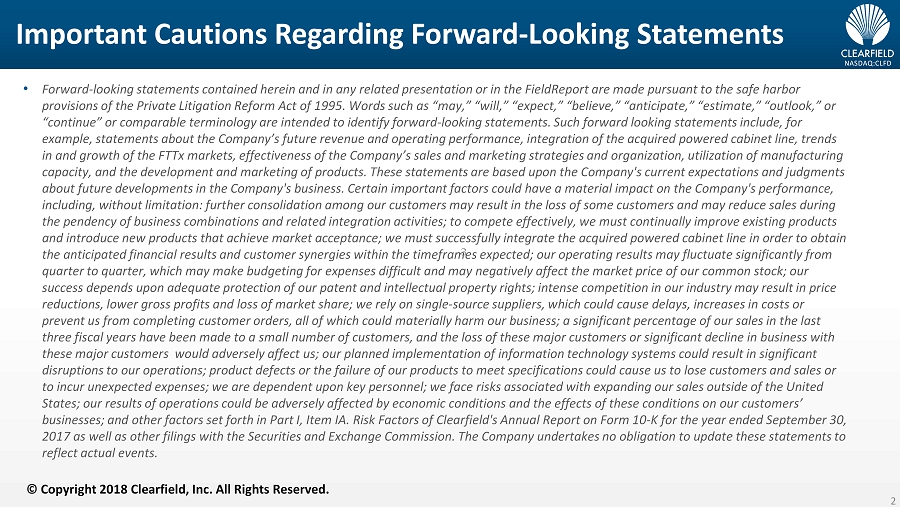NASDAQ:CLFD Important Cautions Regarding Forward - Looking Statements • Forward - looking statements contained herein and in any related presentation or in the FieldReport are made pursuant to the safe harbor provisions of the Private Litigation Reform Act of 1995. Words such as “may,” “will,” “expect,” “believe,” “anticipate,” “est ima te,” “outlook,” or “continue” or comparable terminology are intended to identify forward - looking statements. Such forward looking statements includ e, for example, statements about the Company’s future revenue and operating performance, integration of the acquired powered cabinet li ne, trends in and growth of the FTTx markets, effectiveness of the Company’s sales and marketing strategies and organization, utilizatio n o f manufacturing capacity, and the development and marketing of products. These statements are based upon the Company's current expectations a nd judgments about future developments in the Company's business. Certain important factors could have a material impact on the Company's per formance, including, without limitation: further consolidation among our customers may result in the loss of some customers and may red uce sales during the pendency of business combinations and related integration activities; to compete effectively, we must continually improve ex isting products and introduce new products that achieve market acceptance; we must successfully integrate the acquired powered cabinet line i n o rder to obtain the anticipated financial results and customer synergies within the timeframes expected; our operating results may fluctuate sig nificantly from quarter to quarter, which may make budgeting for expenses difficult and may negatively affect the market price of our common sto ck; our success depends upon adequate protection of our patent and intellectual property rights; intense competition in our industry may result in price reductions, lower gross profits and loss of market share; we rely on single - source suppliers, which could cause delays, increase s in costs or prevent us from completing customer orders, all of which could materially harm our business; a significant percentage of our sal es in the last three fiscal years have been made to a small number of customers, and the loss of these major customers or significant declin e i n business with these major customers would adversely affect us; our planned implementation of information technology systems could result i n s ignificant disruptions to our operations; product defects or the failure of our products to meet specifications could cause us to lose c ust omers and sales or to incur unexpected expenses; we are dependent upon key personnel; we face risks associated with expanding our sales outside of the United States; our results of operations could be adversely affected by economic conditions and the effects of these conditions on o ur customers’ businesses; and other factors set forth in Part I, Item IA. Risk Factors of Clearfield's Annual Report on Form 10 - K for the year ended September 30, 2017 as well as other filings with the Securities and Exchange Commission. The Company undertakes no obligation to update the se statements to reflect actual events. © Copyright 2018 Clearfield, Inc. All Rights Reserved. 2