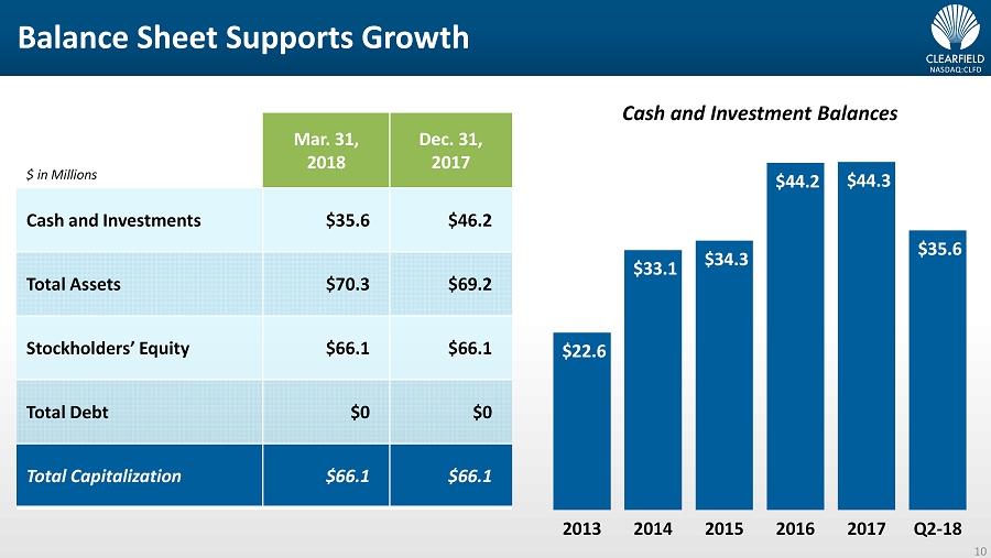 NASDAQ:CLFD FQ2 2018 Revenue Composition and Market Overview Based on revenue of $ 16.8 million for the fiscal quarter ended Mar. 31, 2018. 9 % WIRELESS & CABLE TV 5 % INTERNATIONAL 5% WIRELINE – TIER 1 69% WIRELINE 12% OTHER 12 • Wireless service providers • Multiple service providers (MSOs) • Contract manufacturing • Alternative carriers • Misc. sales • Caribbean/Latin America • Canada • Core: Tier 3 and muni. • Emerging: Tier 2
