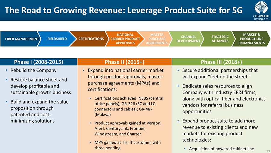 NASDAQ:CLFD Phase I (2008 - 2015) Phase II (2015+) Phase III (2018+) • Rebuild the Company • Restore balance sheet and develop profitable and sustainable growth business • Build and expand the value proposition through patented and cost - minimizing solutions • Expand into national carrier market through product approvals, master purchase agreements (MPAs) and certifications: • Certifications achieved: NEBS (central office panels); GR - 326 (SC and LC connectors and cables); GR - 487 (Makwa) • Product approvals gained at Verizon, AT&T, CenturyLink, Frontier, Windstream, and Charter • MPA gained at Tier 1 customer, with three pending • Secure additional partnerships that will expand “feet on the street” • Dedicate sales resources to align Company with industry EF&I firms, along with optical fiber and electronics vendors for referral business opportunities • Expand product suite to add more revenue to existing clients and new markets for existing product technologies: • Acquisition of powered cabinet line The Road to Growing Revenue: Leverage Product Suite for 5G 13 13 FIBER MANAGEMENT FIELDSHIELD CERTIFICATIONS NATIONAL CARRIER PRODUCT APPROVALS MASTER PURCHASE AGREEMENTS CHANNEL DEVELOPMENT STRATEGIC ALLIANCES MARKET & PRODUCT LINE ENHANCEMENTS