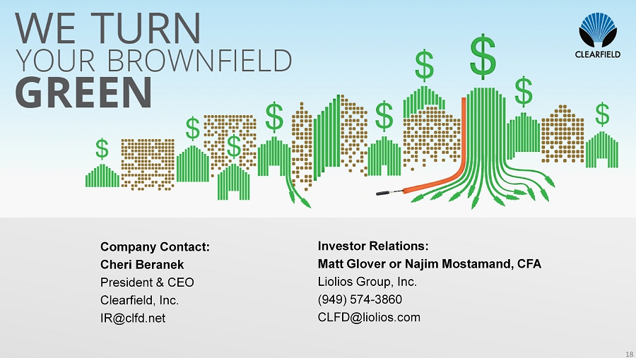 & CEO Clearfield, Inc. IR@clfd.net Investor Relations: Matt Glover or Najim Mostamand, CFA Liolios Group, Inc. (949) 574 - 3860 CLFD@liolios.com 18
