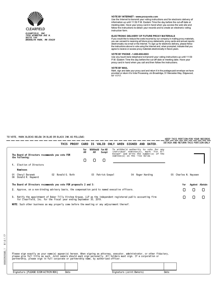 | 3. | Ratify the appointment of Baker Tilly Virchow Krause, LLP as the independent registered public accounting firm for Clearfield, Inc. for the fiscal year ending September 30, 2019. |