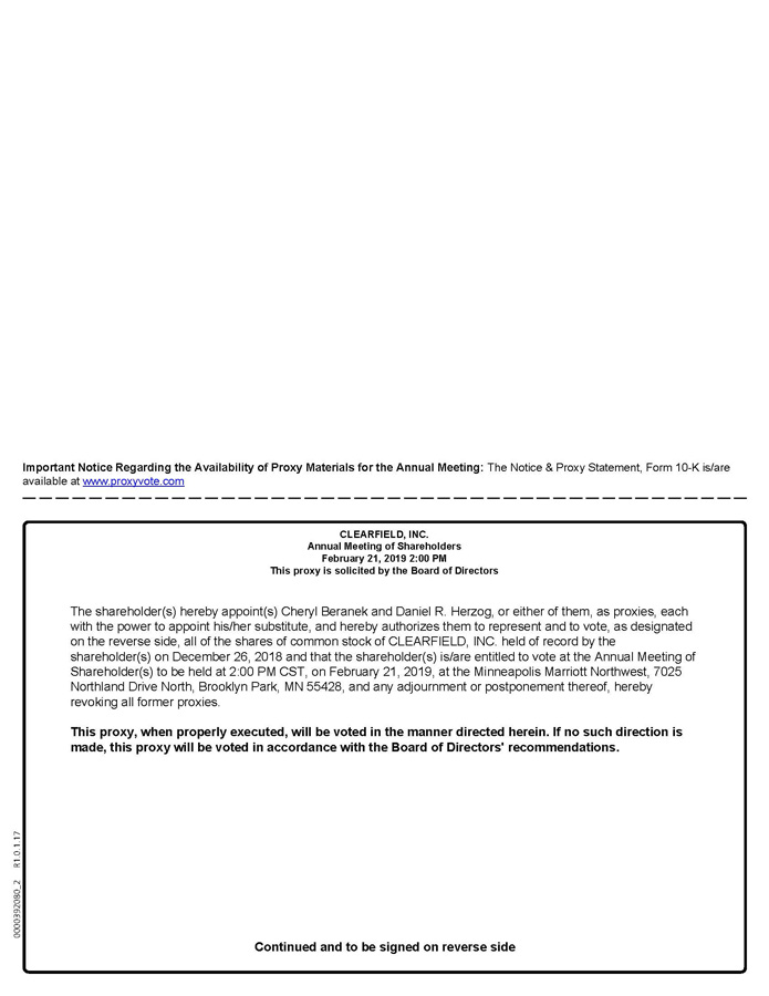 NOTICE IS HEREBY GIVEN that the Annual Meeting of Shareholders of Clearfield, Inc., a Minnesota corporation, will be held on Thursday, February 21, 2019, at 2:00 p.m. (local time), at the Minneapolis Marriott Northwest, 7025 Northland Drive North, Brooklyn Park, MN 55428 for the following purposes: