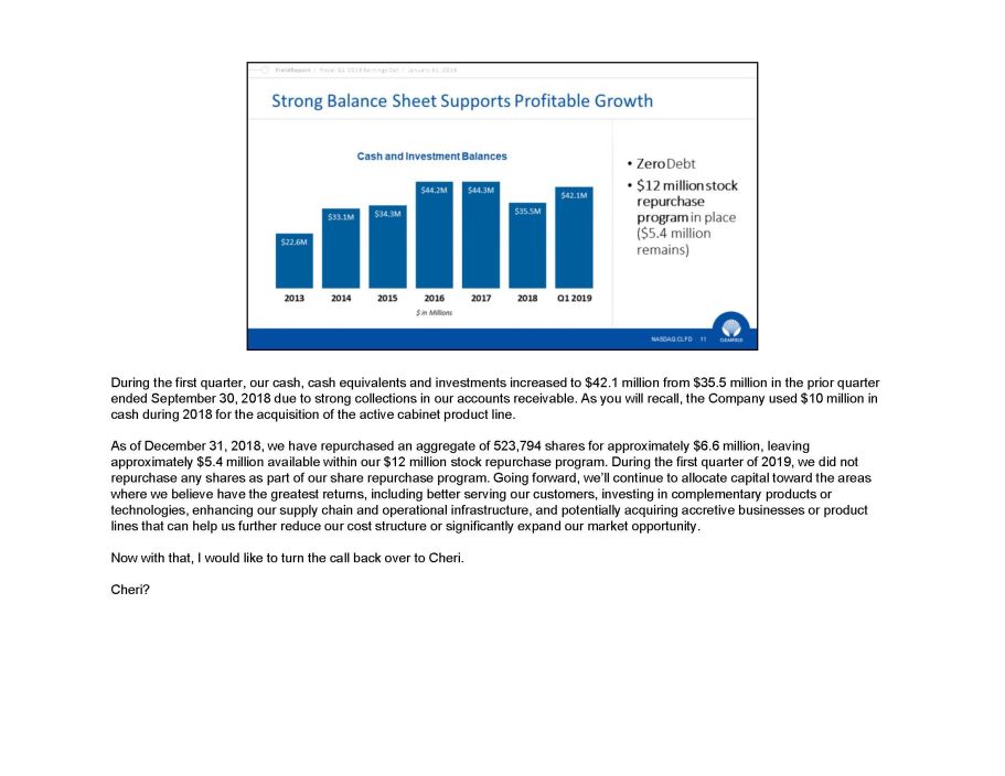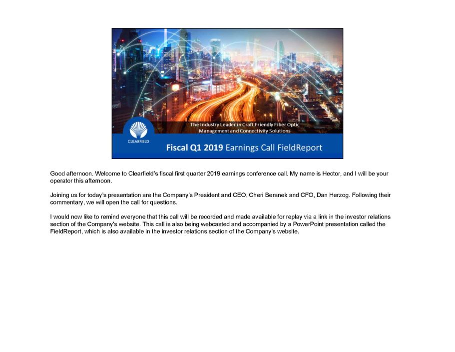 FieldReport / Fiscal Q1 2019 Earnings Call / January 31, 2019 NASDAQ:CLFD The Industry Leader in Craft Friendly Fiber Optic Management and Connectivity Solutions Fiscal Q1 2019 Earnings Call FieldReport