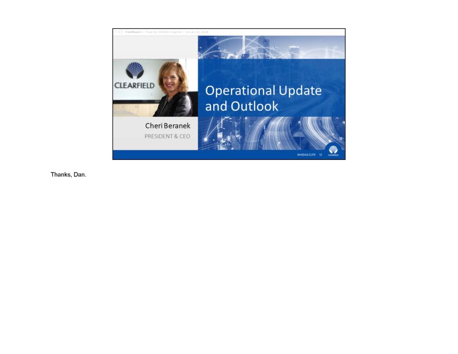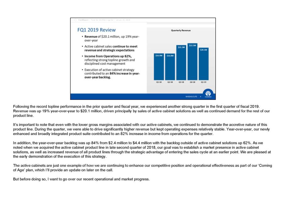 FieldReport / Fiscal Q1 2019 Earnings Call / January 31, 2019 NASDAQ:CLFD Welcome Cheri Beranek PRESIDENT & CEO NASDAQ:CLFD 3