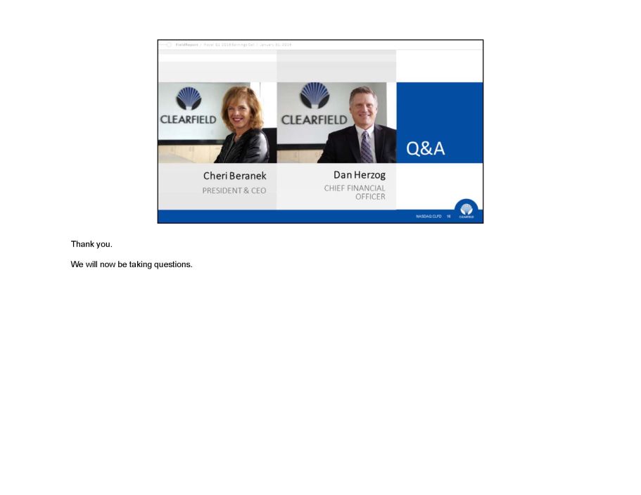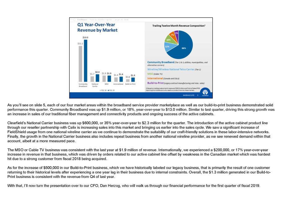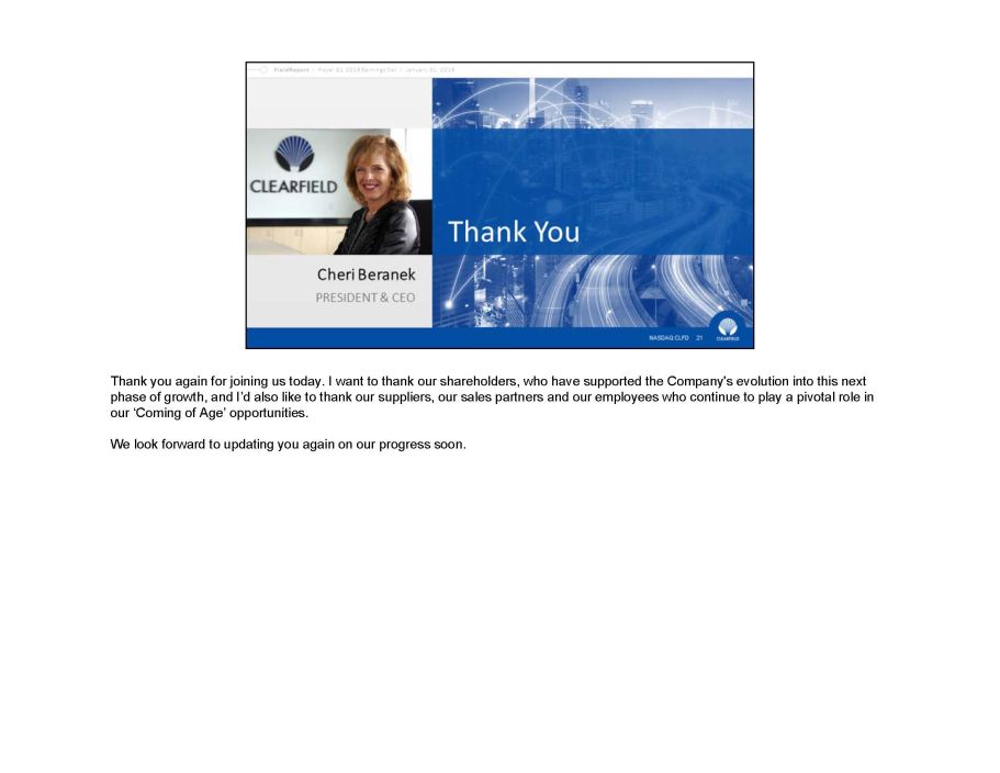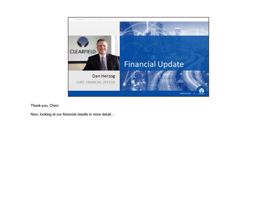 FieldReport / Fiscal Q1 2019 Earnings Call / January 31, 2019 NASDAQ:CLFD Important Cautions Regarding Forward - Looking Statements • Forward - looking statements contained herein and in any related presentation or in the related FieldReport are made pursuant to the safe harbor provisions of the Private Litigation Reform Act of 1995. Words such as “may,” “will,” “expect,” “believe,” “anticipate,” “est ima te,” “outlook,” or “continue” or comparable terminology are intended to identify forward - looking statements. Such forward looking statements includ e, for example, statements about the Company’s future revenue and operating performance, integration of the acquired active cabinet line, tre nds in and growth of the FTTx markets, market segments or customer purchases, effectiveness of the Company’s sales and marketing strategies and organizatio n, utilization of manufacturing capacity, and the development and marketing of products. These statements are based upon the Com pan y's current expectations and judgments about future developments in the Company's business. Certain important factors could have a materi al impact on the Company's performance, including, without limitation: further consolidation among our customers may result in the loss of som e c ustomers and may reduce sales during the pendency of business combinations and related integration activities; to compete effectively, we mus t continually improve existing products and introduce new products that achieve market acceptance; we must successfully integrate the acqui red active cabinet line in order to obtain the anticipated financial results and customer synergies within the timeframes expected; our operatin g r esults may fluctuate significantly from quarter to quarter, which may make budgeting for expenses difficult and may negatively affect the market p ric e of our common stock; our success depends upon adequate protection of our patent and intellectual property rights; intense competition in ou r i ndustry may result in price reductions, lower gross profits and loss of market share; we rely on single - source suppliers, which could cause delays, increases in costs or prevent us from completing customer orders, all of which could materially harm our business; a significant percentage of our sal es in the last three fiscal years have been made to a small number of customers, and the loss of these major customers or significant decline in b usi ness with these major customers would adversely affect us; our planned implementation of information technology systems could result in signi fic ant disruptions to our operations; product defects or the failure of our products to meet specifications could cause us to lose customers and sa les or to incur unexpected expenses; we are dependent upon key personnel; we face risks associated with expanding our sales outside of the Un ite d States; our results of operations could be adversely affected by economic conditions and the effects of these conditions on our customers ’ b usinesses; and other factors set forth in Part I, Item IA. Risk Factors of Clearfield's Annual Report on Form 10 - K for the year ended September 30, 2 018 as well as other filings with the Securities and Exchange Commission. The Company undertakes no obligation to update these statements to refle ct actual events unless required by law. © Copyright 2019 Clearfield, Inc. All Rights Reserved. NASDAQ:CLFD 2