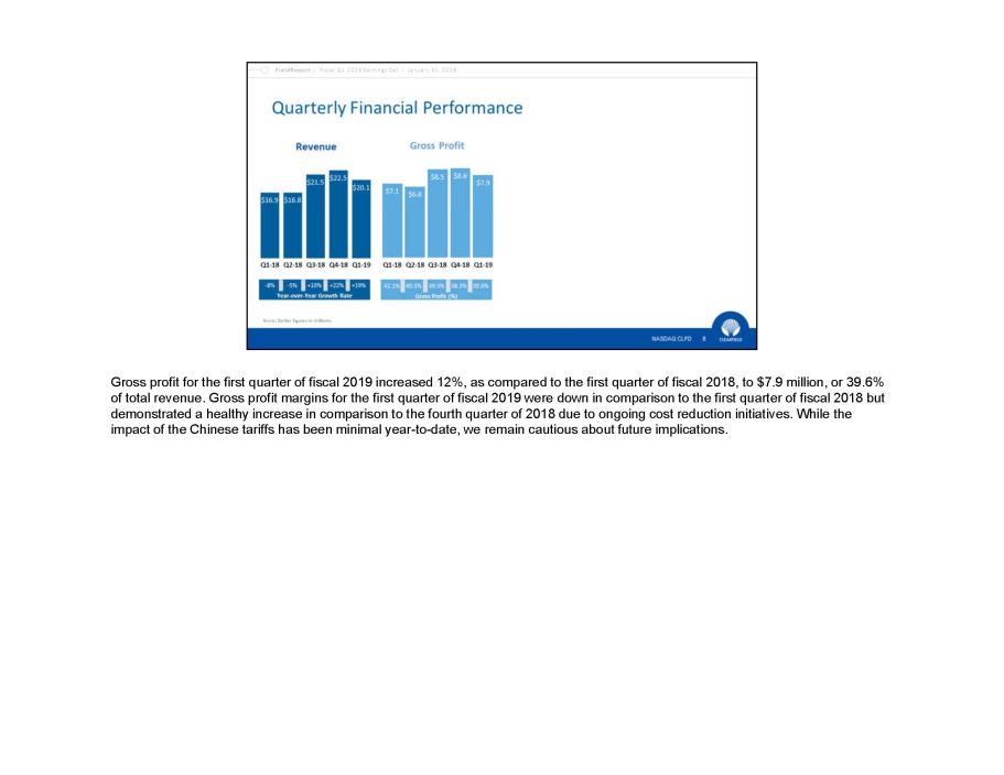 FieldReport / Fiscal Q1 2019 Earnings Call / January 31, 2019 NASDAQ:CLFD 19 NASDAQ:CLFD