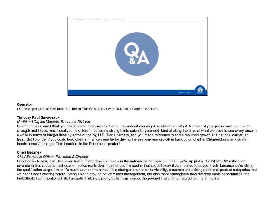FieldReport / Fiscal Q1 2019 Earnings Call / January 31, 2019 NASDAQ:CLFD Q&A Cheri Beranek PRESIDENT & CEO NASDAQ:CLFD 16 Dan Herzog CHIEF FINANCIAL OFFICER