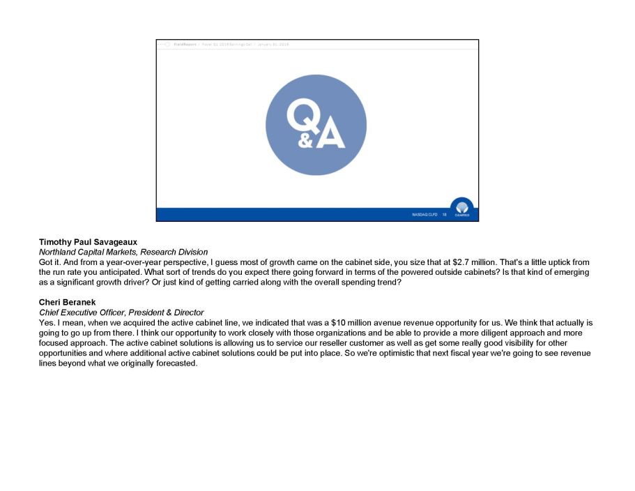 FieldReport / Fiscal Q1 2019 Earnings Call / January 31, 2019 NASDAQ:CLFD 17 NASDAQ:CLFD
