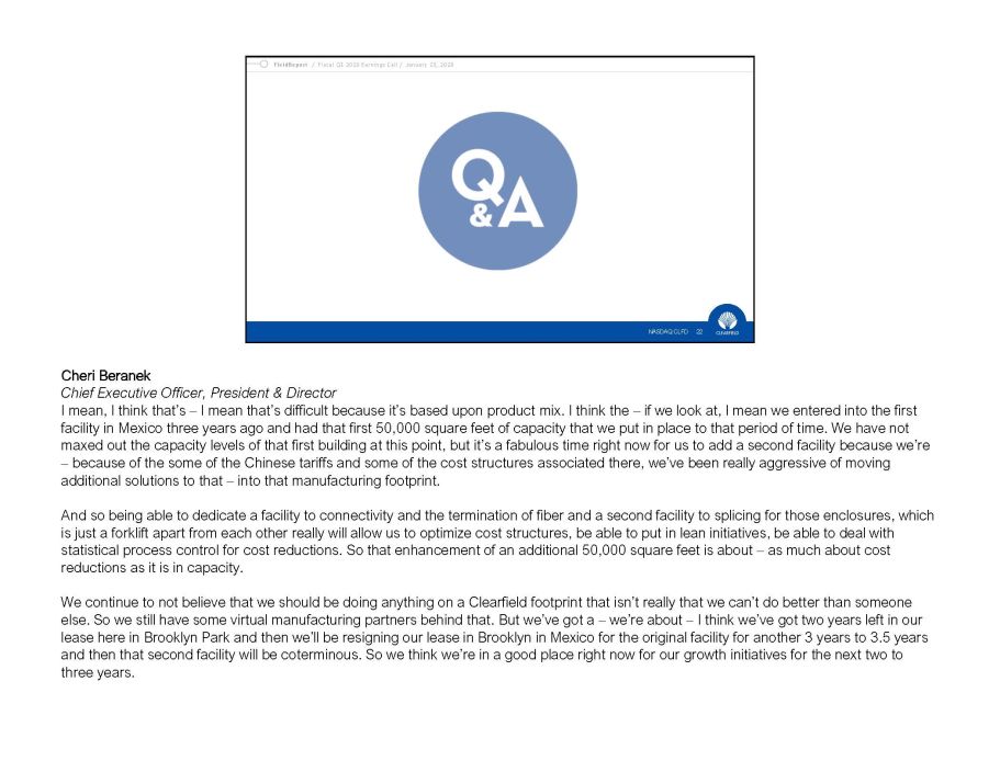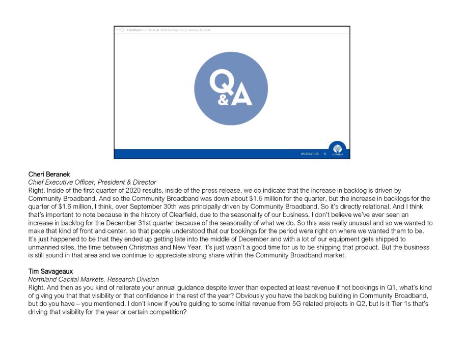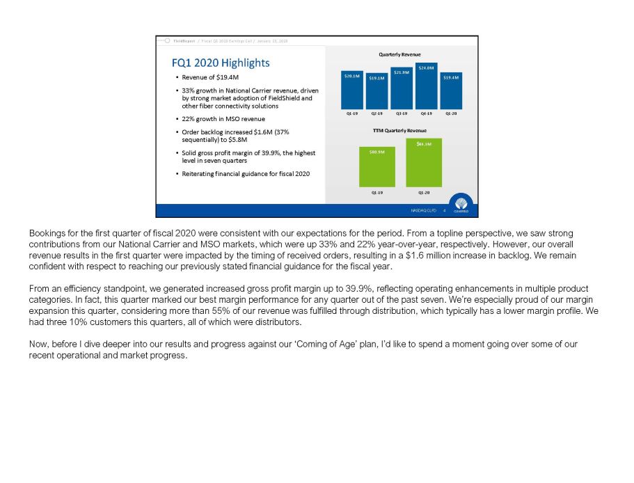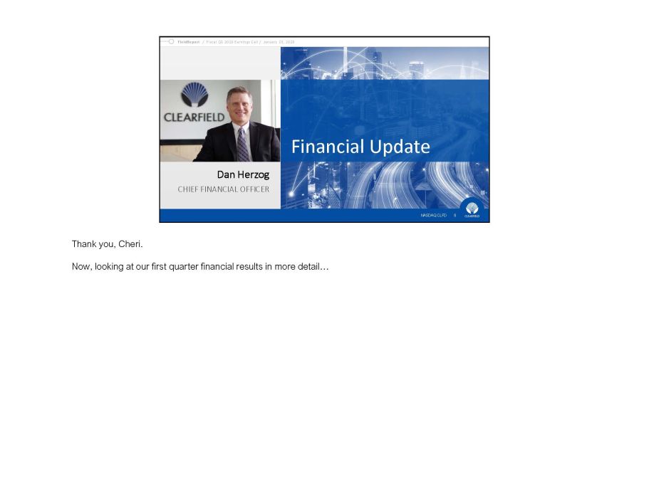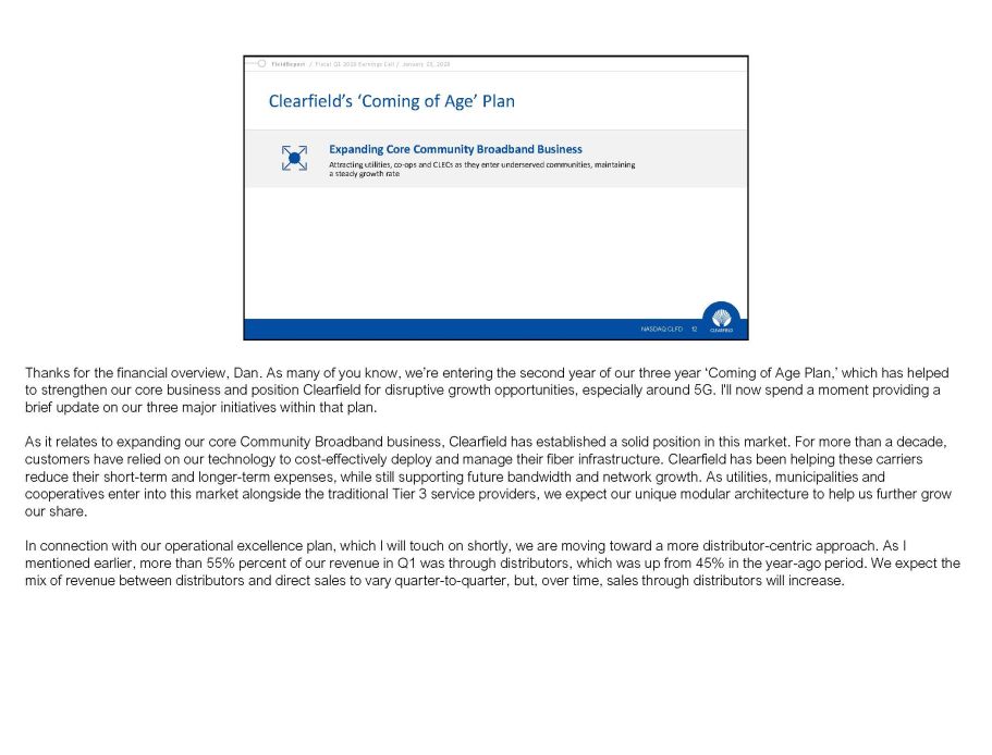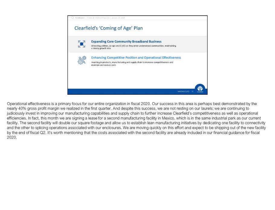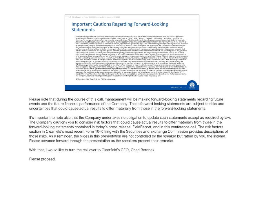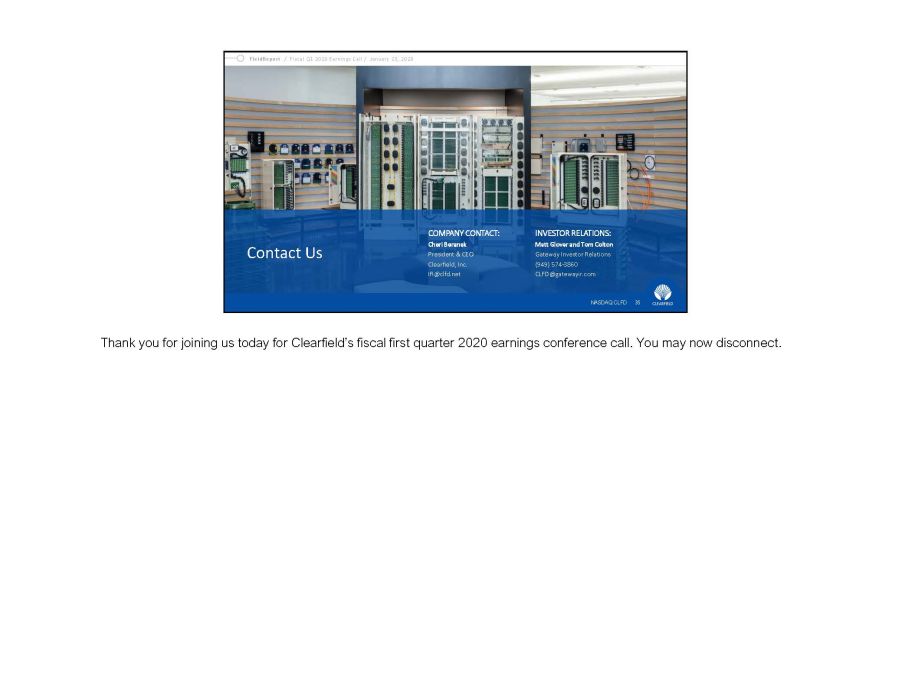 FieldReport / Fiscal Q1 2020 Earnings Call / January 23, 2020 NASDAQ:CLFD Important Cautions Regarding Forward - Looking Statements Forward - looking statements contained herein and in any related presentation or in the related FieldReport are made pursuant to the safe harbor provisions of the Private Litigation Reform Act of 1995. Words such as “may,” “will,” “expect,” “believe,” “anticipate,” “est ima te,” “outlook,” or “continue” or comparable terminology are intended to identify forward - looking statements. Such forward looking statements includ e, for example, statements about the Company’s future revenue and operating performance, integration of the acquired active cabinet line, tre nds in and growth of the FTTx markets, market segments or customer purchases, effectiveness of the Company’s sales and marketing strategies and organizatio n, utilization of manufacturing capacity, and the development and marketing of products. These statements are based upon the Company's curre nt expectations and judgments about future developments in the Company's business. Certain important factors could have a material impact on the Company's performance, including, without limitation: to compete effectively, we must continually improve existing products and introdu ce new products that achieve market acceptance; our expected growth is based upon the expansion of the telecommunications market; our operating re sul ts may fluctuate significantly from quarter to quarter, which may make budgeting for expenses difficult and may negatively affect the market p ric e of our common stock; our success depends upon adequate protection of our patent and intellectual property rights; intense competition in ou r i ndustry may result in price reductions, lower gross profits and loss of market share; we rely on single - source suppliers, which could cause delays, in creases in costs or prevent us from completing customer orders, all of which could materially harm our business; a significant percentage of our sales in th e last three fiscal years have been made to a small number of customers, and the loss of these major customers or significant decline in business with the se major customers would adversely affect us; further consolidation among our customers may result in the loss of some customers and may reduce sal es during the pendency of business combinations and related integration activities; we may be subject to risks associated with acquisitions th at could adversely affect future operating results; product defects or the failure of our products to meet specifications could cause us to lose cu stomers and sales or to incur unexpected expenses; we are dependent upon key personnel; we face risks associated with expanding our sales outside of the United States; our business is dependent on effective management information systems and information technology infrastructure; our results of o per ations could be adversely affected by economic conditions and the effects of these conditions on our customers’ businesses; changes in govern men t funding programs may cause our customers and prospective customers to delay or reduce purchases; and other factors set forth in Part I, Item I A. Risk Factors of Clearfield's Annual Report on Form 10 - K for the year ended September 30, 2019 as well as other filings with the Securities and E xchange Commission. The Company undertakes no obligation to update these statements to reflect actual events unless required by law. © Copyright 2020 Clearfield, Inc. All Rights Reserved. NASDAQ:CLFD 2