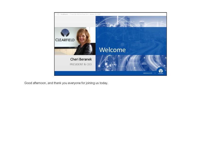 FieldReport / Fiscal Q1 2020 Earnings Call / January 23, 2020 NASDAQ:CLFD Welcome Cheri Beranek PRESIDENT & CEO NASDAQ:CLFD 3