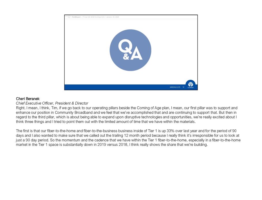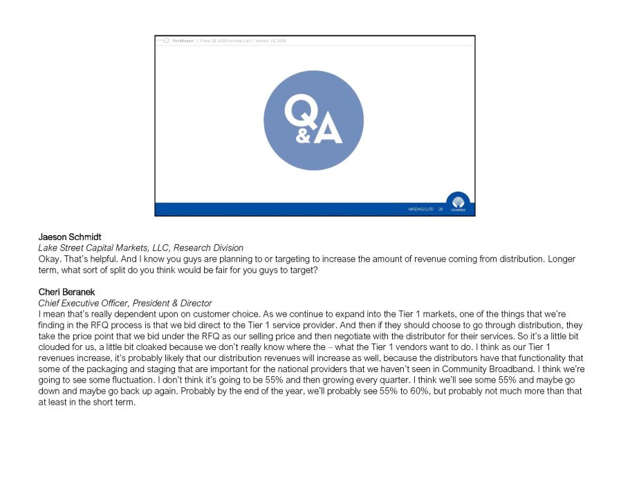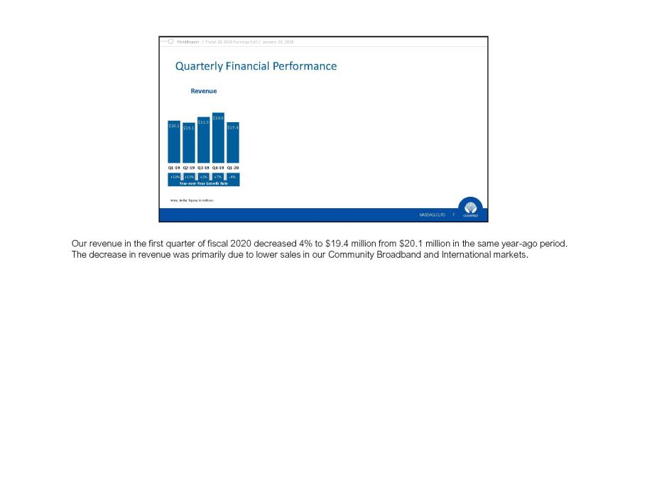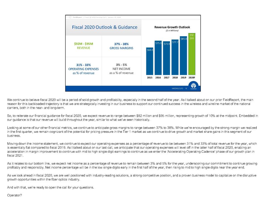 FieldReport / Fiscal Q1 2020 Earnings Call / January 23, 2020 NASDAQ:CLFD The Industry Leader in Craft Friendly Fiber Optic Management and Connectivity Solutions Fiscal Q1 2020 Earnings Call FieldReport