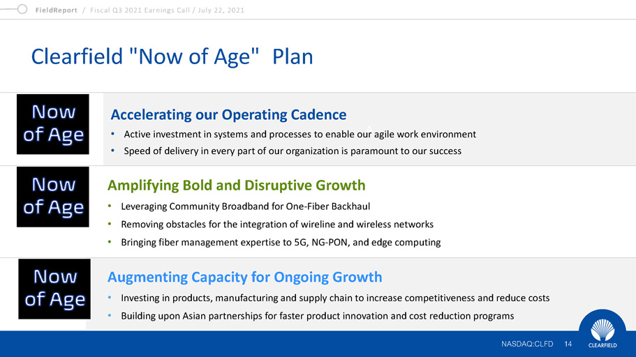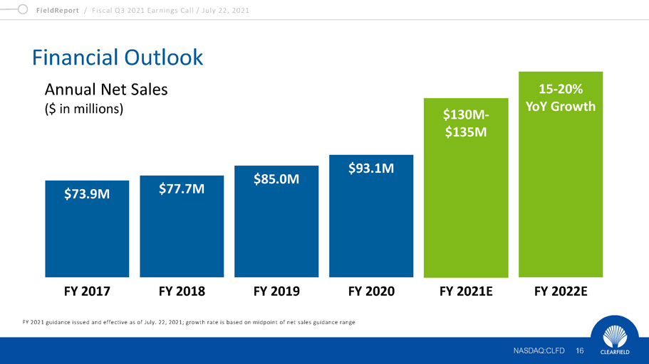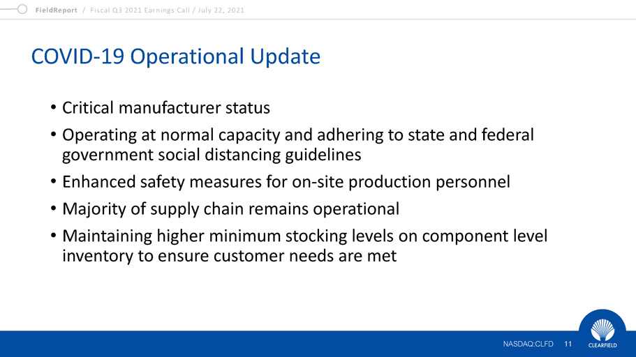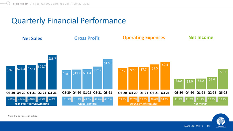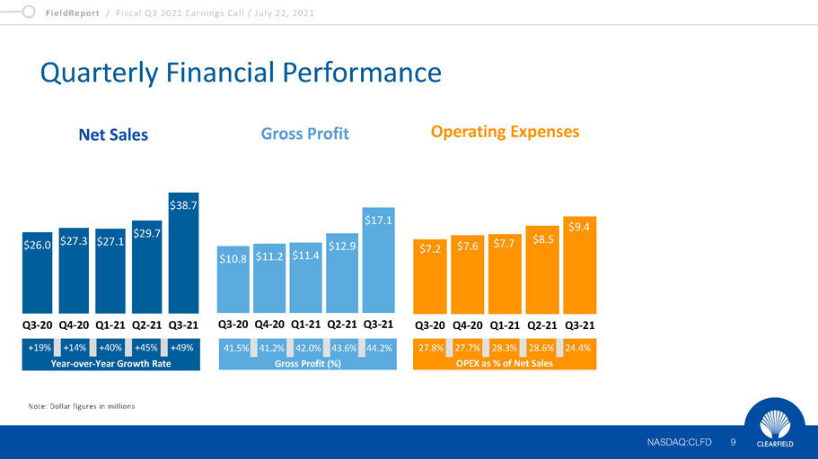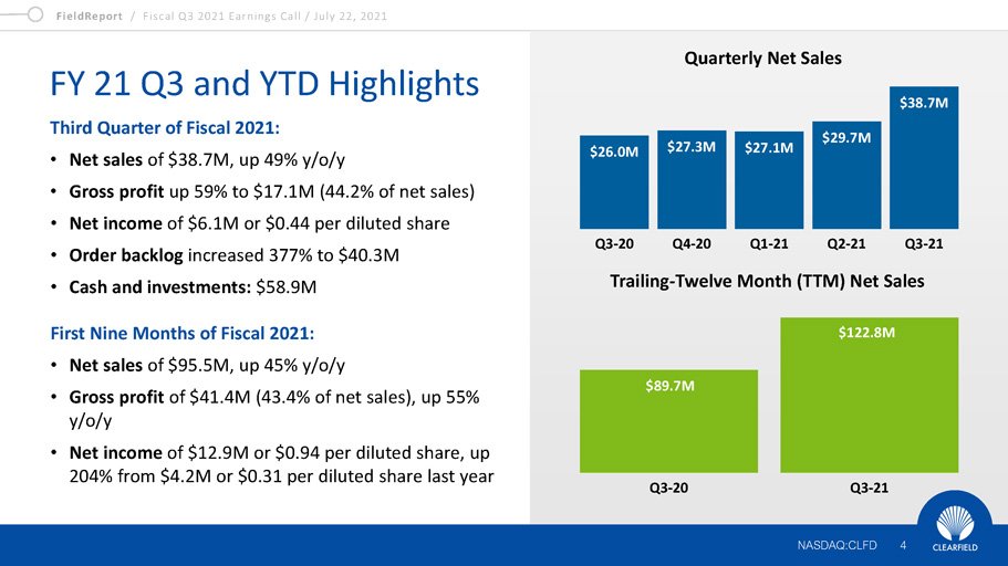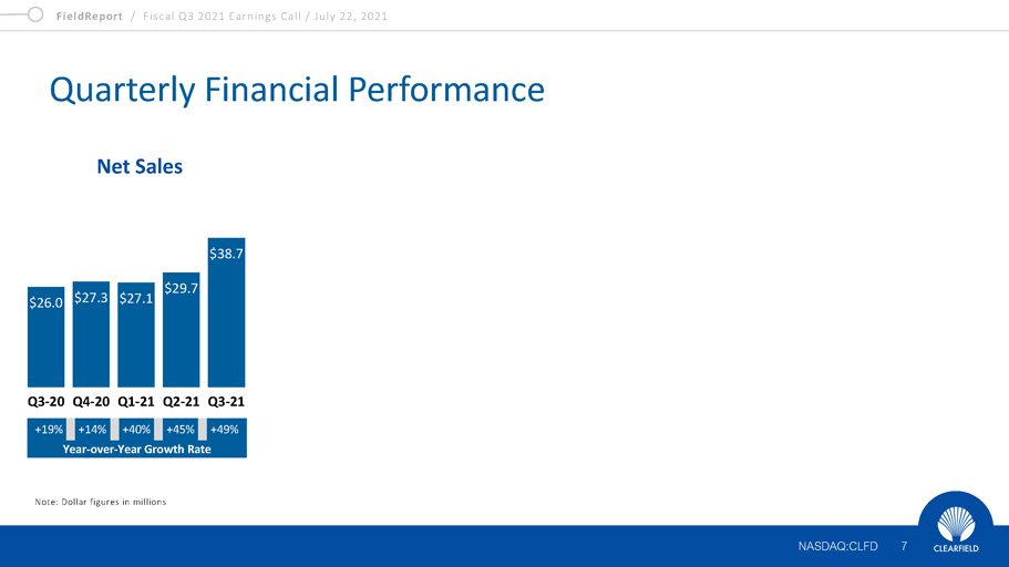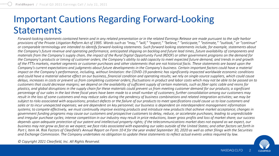 FieldReport / Fiscal Q3 2021 Earnings Call / July 22, 2021 NASDAQ:CLFD Important Cautions Regarding Forward - Looking Statements Forward - looking statements contained herein and in any related presentation or in the related Earnings Release are made pursuant to the safe harbor provisions of the Private Litigation Reform Act of 1995. Words such as “may,” “will,” “expect,” “believe,” “anticipate,” “est ima te,” “outlook,” or “continue” or comparable terminology are intended to identify forward - looking statements. Such forward looking statements include, for exam ple, statements about the Company’s future revenue and operating performance, anticipated shipping on backlog and future lead times, future availab ili ty of components and materials from the Company’s supply chain, the impact of the Rural Digital Opportunity Fund (RDOF) or other government progra ms on the demand for the Company’s products or timing of customer orders, the Company’s ability to add capacity to meet expected future demand, an d t rends in and growth of the FTTx markets, market segments or customer purchases and other statements that are not historical facts. These statements are based u pon the Company's current expectations and judgments about future developments in the Company's business. Certain important factors c oul d have a material impact on the Company's performance, including, without limitation: the COVID - 19 pandemic has significantly impacted worldwide e conomic conditions and could have a material adverse effect on our business, financial condition and operating results; we rely on single - source su ppliers, which could cause delays, increases in costs or prevent us from completing customer orders; fluctuations in product and labor costs which may n ot be able to be passed on to customers that could decrease margins; we depend on the availability of sufficient supply of certain materials, such as fiber op tic cable and resins for plastics, and global disruptions in the supply chain for these materials could prevent us from meeting customer demand for ou r p roducts; a significant percentage of our sales in the last three fiscal years have been made to a small number of customers; further consolidation a mon g our customers may result in the loss of some customers and may reduce sales during the pendency of business combinations and related integratio n a ctivities; we may be subject to risks associated with acquisitions; product defects or the failure of our products to meet specifications could ca use us to lose customers and sales or to incur unexpected expenses; we are dependent on key personnel; our business is dependent on interdependent managem ent information systems; to compete effectively, we must continually improve existing products and introduce new products that achieve market ac ceptance; changes in government funding programs may cause our customers and prospective customers to delay, reduce, or accelerate purchases, lead ing to unpredictable and irregular purchase cycles; intense competition in our industry may result in price reductions, lower gross profits and lo ss of market share; our success depends upon adequate protection of our patent and intellectual property rights; if the telecommunications market does not ex pan d as we expect, our business may not grow as fast as we expect; we face risks associated with expanding our sales outside of the United States; a nd other factors set forth in Part I, Item IA. Risk Factors of Clearfield's Annual Report on Form 10 - K for the year ended September 30, 2020 as well as other filings with the Securities and Exchange Commission. The Company undertakes no obligation to update these statements to reflect actual events unless requ ire d by law. © Copyright 2021 Clearfield, Inc. All Rights Reserved. NASDAQ:CLFD 2