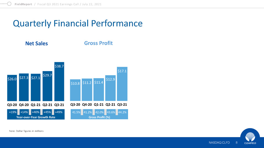 FieldReport / Fiscal Q3 2021 Earnings Call / July 22, 2021 NASDAQ:CLFD Quarterly Financial Performance 7 NASDAQ:CLFD Note: Dollar figures in millions $26.0 $27.3 $27.1 $29.7 $38.7 Q3-20 Q4-20 Q1-21 Q2-21 Q3-21 Net Sales +19% +14% +40% +45% +49% Year - over - Year Growth Rate