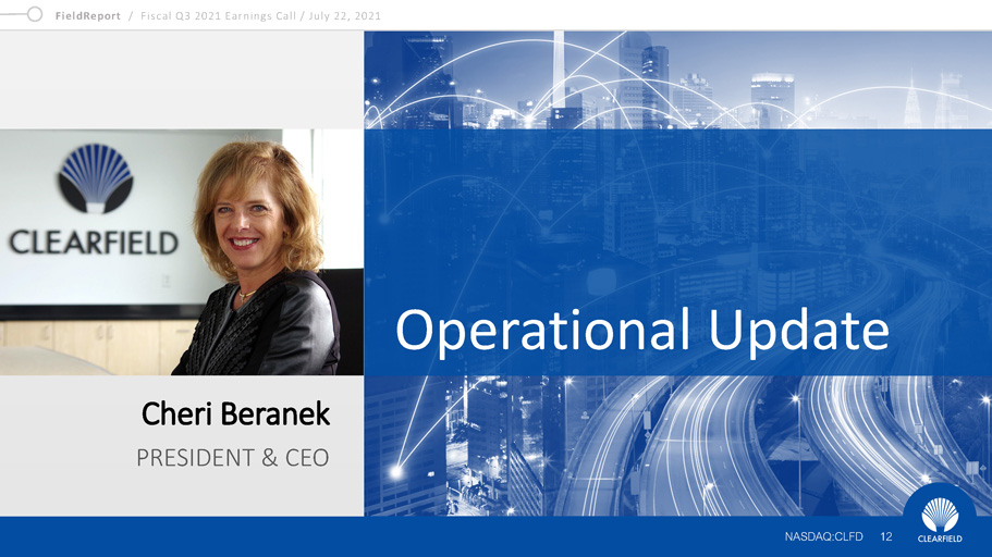 FieldReport / Fiscal Q3 2021 Earnings Call / July 22, 2021 NASDAQ:CLFD Operational Update Cheri Beranek PRESIDENT & CEO NASDAQ:CLFD 12