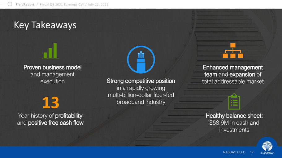 FieldReport / Fiscal Q3 2021 Earnings Call / July 22, 2021 NASDAQ:CLFD Key Takeaways Proven business model and management execution Enhanced management team and expansion of total addressable market Strong competitive position in a rapidly growing multi - billion - dollar fiber - fed broadband industry Healthy balance sheet: $58.9M in cash and investments Year history of profitability and positive free cash flow 13 NASDAQ:CLFD 17