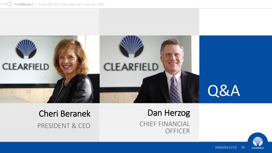 FieldReport / Fiscal Q3 2021 Earnings Call / July 22, 2021 NASDAQ:CLFD Q&A Cheri Beranek PRESIDENT & CEO NASDAQ:CLFD 25 Dan Herzog CHIEF FINANCIAL OFFICER