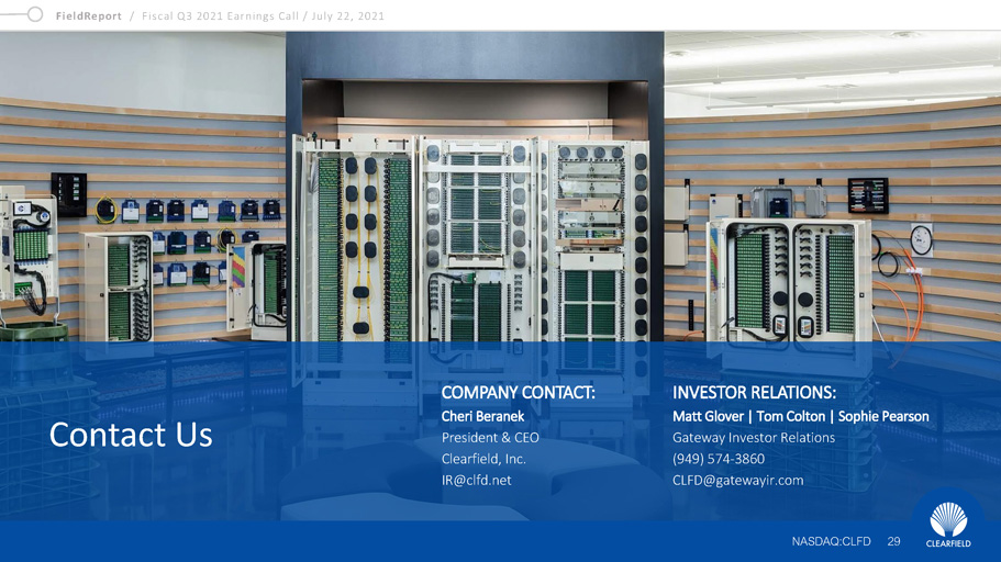 FieldReport / Fiscal Q3 2021 Earnings Call / July 22, 2021 NASDAQ:CLFD Contact Us NASDAQ:CLFD 29 COMPANY CONTACT: Cheri Beranek President & CEO Clearfield, Inc. IR@clfd.net INVESTOR RELATIONS: Matt Glover | Tom Colton | Sophie Pearson Gateway Investor Relations (949) 574 - 3860 CLFD@gatewayir.com