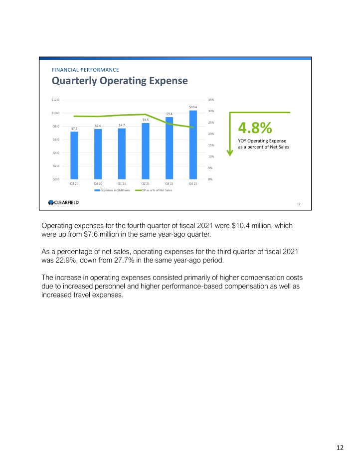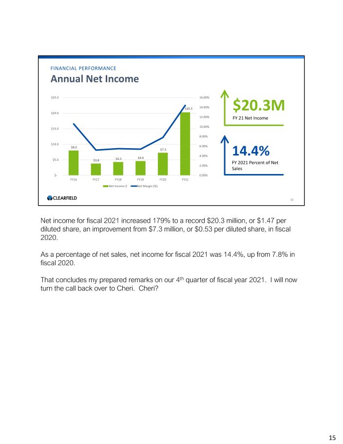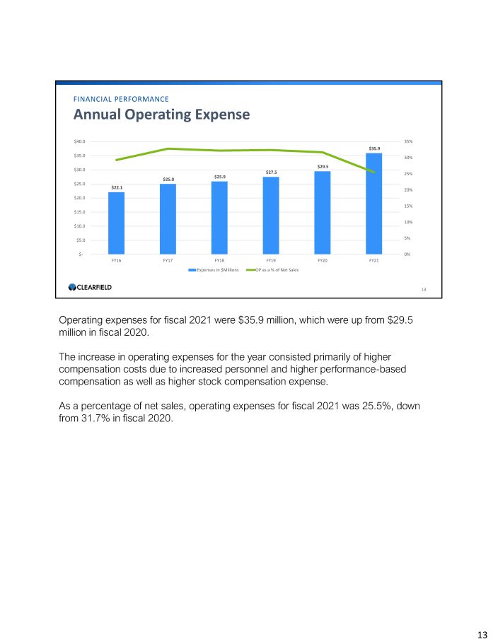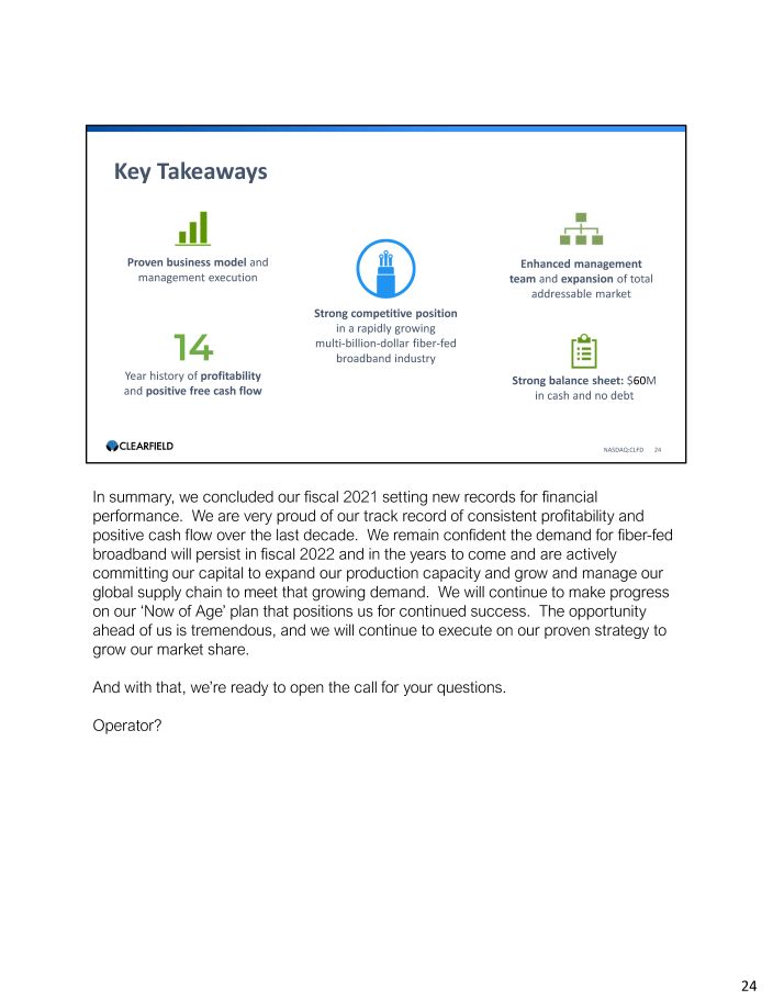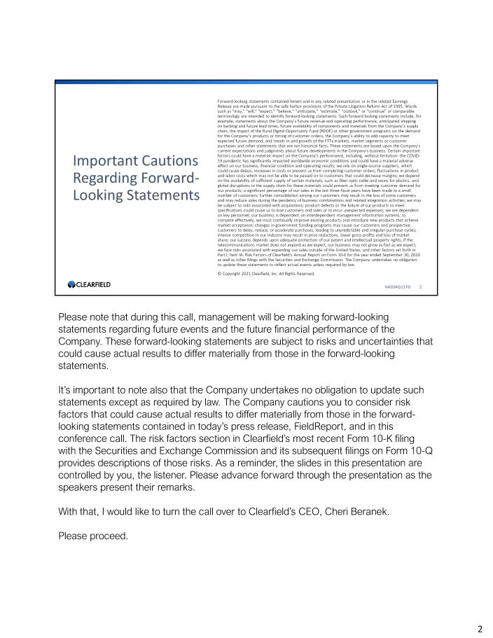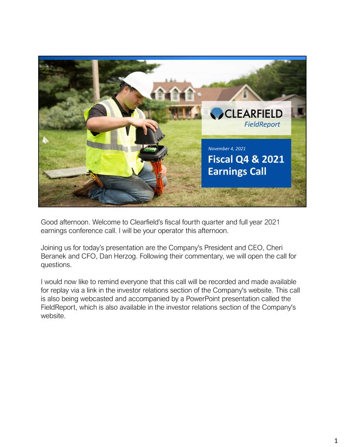 November 4, 2021 Fiscal Q4 & 2021 Earnings Call FieldReport Good afternoon. Welcome to Clearfield’s fiscal fourth quarter and full year 2021 earnings conference call. I will be your operator this afternoon. Joining us for today’s presentation are the Company's President and CEO, Cheri Beranek and CFO, Dan Herzog. Following their commentary, we will open the call for questions. I would now like to remind everyone that this call will be recorded and made available for replay via a link in the investor relations section of the Company's website. This call is also being webcasted and accompanied by a PowerPoint presentation called the FieldReport, which is also available in the investor relations section of the Company's website. 1