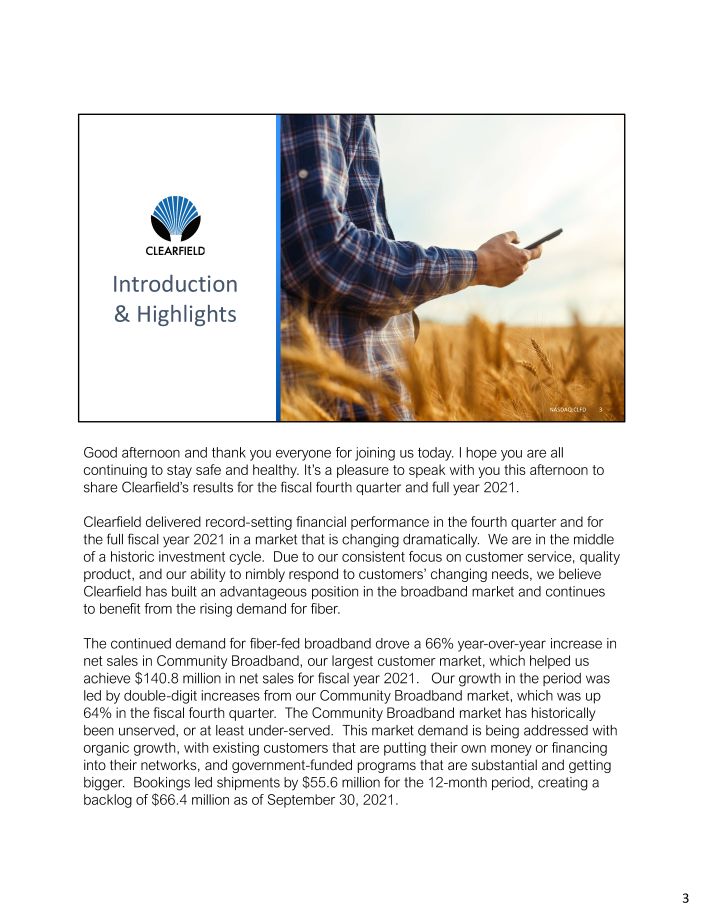 Important Cautions Regarding Forward - Looking Statements N A S DAQ:CLFD 2 Forward - looking statements contained herein and in any related presentation or in the related Earnings Release are made pursuant to the safe harbor provisions of the Private Litigation Reform Act of 1995. Words such as “may,” “will,” “expect,” “believe,” “anticipate,” “estimate,” “outlook,” or “continue” or comparable terminology are intended to identify forward - looking statements. Such forward looking statements include, for example, statements about the Company’s future revenue and operating performance, anticipated shipping on backlog and future lead times, future availability of components and materials from the Company’s supply chain, the impact of the Rural Digital Opportunity Fund (RDOF) or other government programs on the demand for the Company’s products or timing of customer orders, the Company’s ability to add capacity to meet expected future demand, and trends in and growth of the FTTx markets, market segments or customer purchases and other statements that are not historical facts. These statements are based upon the Company's current expectations and judgments about future developments in the Company's business. Certain important factors could have a material impact on the Company's performance, including, without limitation: the COVID - 19 pandemic has significantly impacted worldwide economic conditions and could have a material adverse effect on our business, financial condition and operating results; we rely on single - source suppliers, which could cause delays, increases in costs or prevent us from completing customer orders; fluctuations in product and labor costs which may not be able to be passed on to customers that could decrease margins; we depend on the availability of sufficient supply of certain materials, such as fiber optic cable and resins for plastics, and global disruptions in the supply chain for these materials could prevent us from meeting customer demand for our products; a significant percentage of our sales in the last three fiscal years have been made to a small number of customers; further consolidation among our customers may result in the loss of some customers and may reduce sales during the pendency of business combinations and related integration activities; we may be subject to risks associated with acquisitions; product defects or the failure of our products to meet specifications could cause us to lose customers and sales or to incur unexpected expenses; we are dependent on key personnel; our business is dependent on interdependent management information systems; to compete effectively, we must continually improve existing products and introduce new products that achieve market acceptance; changes in government funding programs may cause our customers and prospective customers to delay, reduce, or accelerate purchases, leading to unpredictable and irregular purchase cycles; intense competition in our industry may result in price reductions, lower gross profits and loss of market share; our success depends upon adequate protection of our patent and intellectual property rights; if the telecommunications market does not expand as we expect, our business may not grow as fast as we expect; we face risks associated with expanding our sales outside of the United States; and other factors set forth in Part I, Item IA. Risk Factors of Clearfield's Annual Report on Form 10 - K for the year ended September 30, 2020 as well as other filings with the Securities and Exchange Commission. The Company undertakes no obligation to update these statements to reflect actual events unless required by law. © Copyright 2021 Clearfield, Inc. All Rights Reserved. Please note that during this call, management will be making forward - looking statements regarding future events and the future financial performance of the Company. These forward - looking statements are subject to risks and uncertainties that could cause actual results to differ materially from those in the forward - looking statements. It’s important to note also that the Company undertakes no obligation to update such statements except as required by law. The Company cautions you to consider risk factors that could cause actual results to differ materially from those in the forward - looking statements contained in today’s press release, FieldReport, and in this conference call. The risk factors section in Clearfield’s most recent Form 10 - K filing with the Securities and Exchange Commission and its subsequent filings on Form 10 - Q provides descriptions of those risks. As a reminder, the slides in this presentation are controlled by you, the listener. Please advance forward through the presentation as the s p e a k e r s p r e s e n t t h e i r r e m a r k s . With that, I would like to turn the call over to Clearfield’s CEO, Cheri Beranek. Please proceed. 2