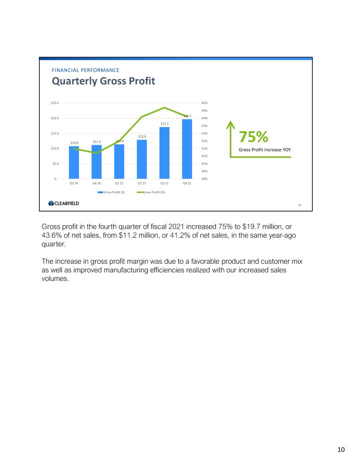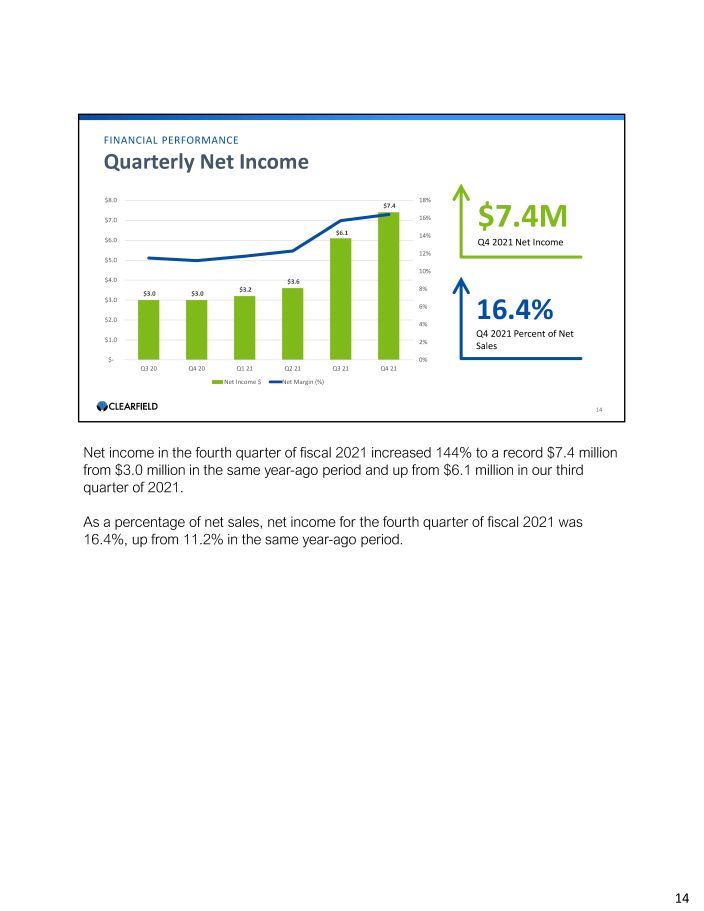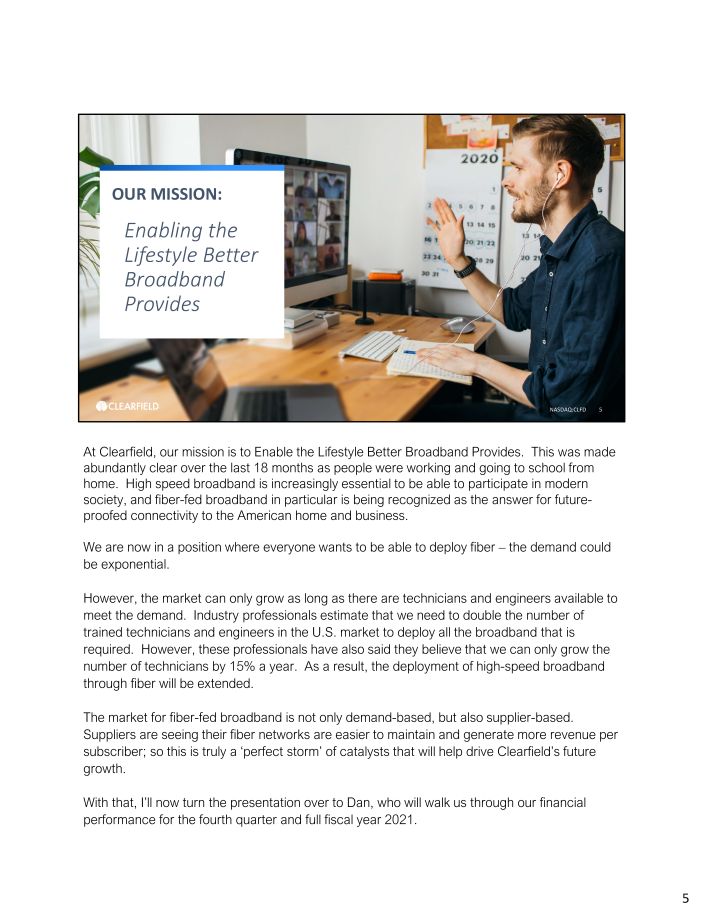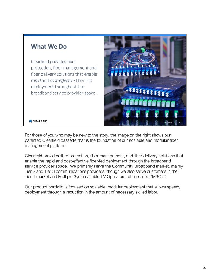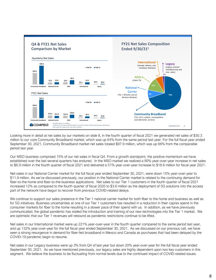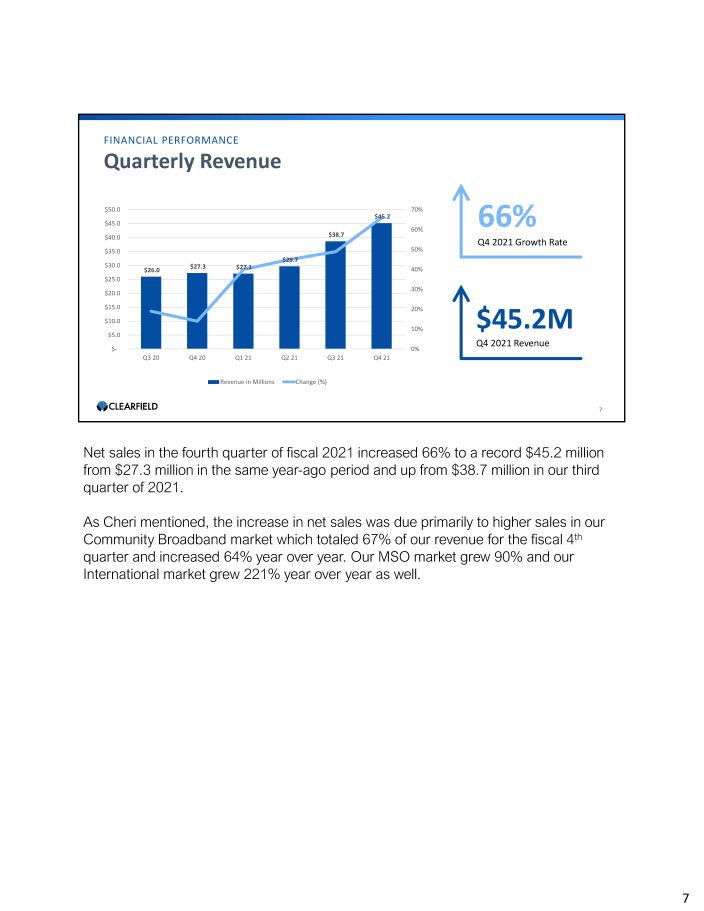N A S DAQ:CLFD 3 I nt ro d u c t i o n & Highlights Good afternoon and thank you everyone for joining us today. I hope you are all continuing to stay safe and healthy. It’s a pleasure to speak with you this afternoon to share Clearfield’s results for the fiscal fourth quarter and full year 2021. Clearfield delivered record - setting financial performance in the fourth quarter and for the full fiscal year 2021 in a market that is changing dramatically. We are in the middle of a historic investment cycle. Due to our consistent focus on customer service, quality product, and our ability to nimbly respond to customers’ changing needs, we believe Clearfield has built an advantageous position in the broadband market and continues t o b e ne f i t f r o m t h e ri s i n g d e m a n d f o r f i b e r . The continued demand for fiber - fed broadband drove a 66% year - over - year increase in net sales in Community Broadband, our largest customer market, which helped us achieve $140.8 million in net sales for fiscal year 2021. Our growth in the period was led by double - digit increases from our Community Broadband market, which was up 64% in the fiscal fourth quarter. The Community Broadband market has historically been unserved, or at least under - served. This market demand is being addressed with organic growth, with existing customers that are putting their own money or financing into their networks, and government - funded programs that are substantial and getting bigger. Bookings led shipments by $55.6 million for the 12 - month period, creating a b a c k l o g o f $ 66 . 4 m illi o n a s o f S e p t e m b e r 30 , 2 021 . 3