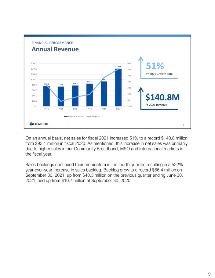 $1 8 . 5 $3 . 2 $3 . 6 $1 . 1 $0 . 9 $3 . 6 $6 . 9 $3 . 5 $0 . 9 Co mm unity B r o a db a n d N a tion a l C a r ri e r M S O International L e g a c y FQ4 20 FQ4 21 Q4 & FY21 Net Sales Comparison by Market N A S DAQ:CLFD 8 FY21 Net Sales Composition Ended 9/30/21 1 Legacy (Legacy contract manufacturing and misc. sales) 70% 8% 13% 7% 2% $5 9 . 0 $4 . 1 $3 . 5 $14.1 $11.9 $18 . 6 $12.4 $9 . 5 $2 . 8 Community Broadband National Carrier MSO International Legacy All dollar figures in millions 1) Based on net sales of $140.8 million and Point of Sales (POS) reporting from distributors who resell our product line into these markets. FQ4 20 FQ4 21 Quarterly Net Sales $30.3 FY21 Net Sales $9 7 . 9 Community Broadband (Tier 2 & 3, utilities, municipalities, and alternative carriers) N a ti o n al C a rri e r (Tier 1 Wireline and all W i re l ess M ar k e t s) MS O (C ab l e TV) International (Canada, Mexico, and Caribbean Markets) Looking more in detail at net sales by our markets on slide 8, in the fourth quarter of fiscal 2021 we generated net sales of $30.3 million to our core Community Broadband market, which was up 64% from the same period last year. For the full fiscal year ended September 30, 2021, Community Broadband market net sales totaled $97.9 million, which was up 66% from the comparable period last year. Our MSO business comprised 15% of our net sales in fiscal Q4. From a growth standpoint, the positive momentum we have established over the last several quarters has endured. In the MSO market we realized a 90% year - over - year increase in net sales to $6.9 million in the fourth quarter of fiscal 2021 and delivered a 51% year - over - year increase to $18.6 million for fiscal year 2021. Net sales in our National Carrier market for the full fiscal year ended September 30, 2021, were down 15% year - over - year to $11.9 million. As we’ve discussed previously, our position in the National Carrier market is related to the continuing demand for fiber - to - the - home and fiber - to - the - business applications. Net sales to our Tier 1 customers in the fourth quarter of fiscal 2021 increased 12% as compared to the fourth quarter of fiscal 2020 to $3.6 million as the deployment of 5G solutions into the access part of the network have begun to recover from previous COVID - related delays. We continue to support our sales presence in the Tier 1 national carrier market for both fiber to the home and business as well as for 5G initiatives. Business uncertainties at one of our Tier 1 customers has resulted in a reduction in their cap/ex spend in the consumer markets for fiber to the home resulting in a slower pace of their spend with us. In addition, as we have previously communicated, the global pandemic has stalled the introduction and training of our new technologies into the Tier 1 market. We are optimistic that our Tier 1 revenues will rebound as pandemic restrictions continue to be lifted. Net sales in our International market were up 221 % year - over - year in the fourth quarter compared to the same period last year, and up 132 % year - over - year for the full fiscal year ended September 30 , 2021 . As we discussed on our previous call, we have seen a strong resurgence in demand for fiber - fed broadband in Mexico and Canada as purchases that had been delayed by the COVID - 19 pandemic begin to resume . Net sales in our Legacy business were up 3% from Q4 of last year but down 20% year - over - year for the full fiscal year ended September 30, 2021. As we have mentioned previously, our legacy sales are highly dependent upon two key customers in this segment. We believe the business to be fluctuating from normal levels due to the continued impact of COVID - related issues. 8