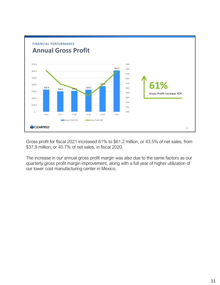 $10 . 8 $11 . 2 $12 . 9 $17 . 1 $19 . 7 41% 40% 41% $11 . 4 42% 43% 43% 44% 45% 44% $ 5 .0 $ 1 0.0 42% $ 1 5.0 $ 2 0.0 $ 2 5.0 $ - 40% Q3 20 Q4 20 Q1 21 Q2 21 Q3 21 Q4 21 Gross Profit ($) Gross Profit (%) 10 FINANCIAL PERFORMANCE Quarterly Gross Profit 75% Gross Profit increase YOY Gross profit in the fourth quarter of fiscal 2021 increased 75% to $19.7 million, or 43.6% of net sales, from $11.2 million, or 41.2% of net sales, in the same year - ago quarter. The increase in gross profit margin was due to a favorable product and customer mix as well as improved manufacturing efficiencies realized with our increased sales volumes. 10