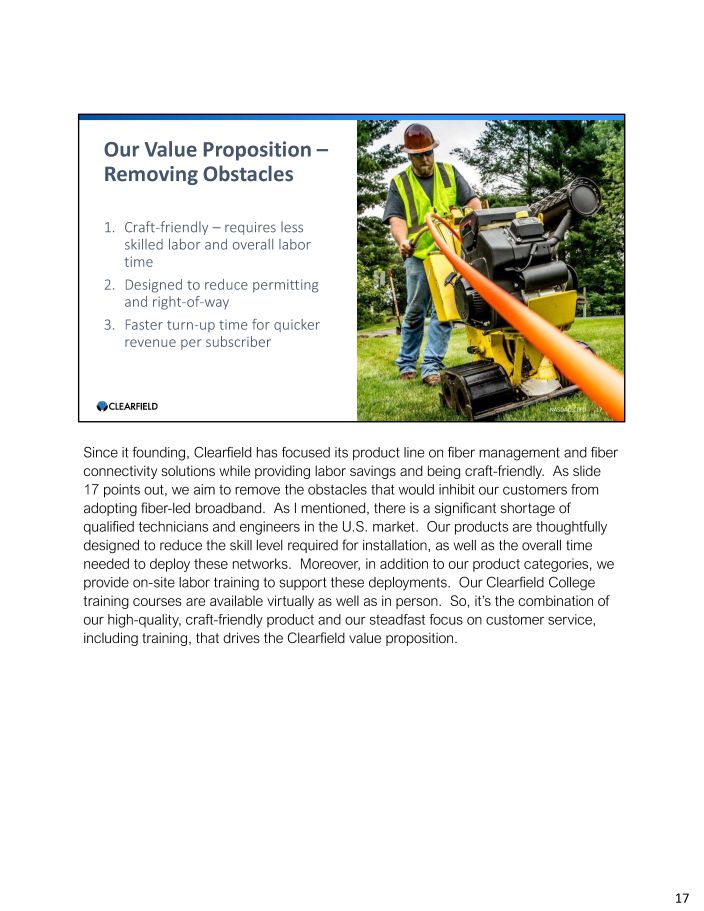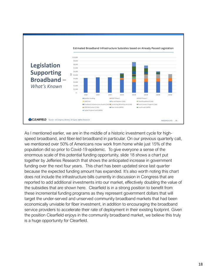 Our Value Proposition – Removing Obstacles 1. Craft - friendly – requires less skilled labor and overall labor time 2. Designed to reduce permitting and right - of - way 3. Faster turn - up time for quicker revenue per subscriber NASDAQ:CLFD 17 Since it founding, Clearfield has focused its product line on fiber management and fiber connectivity solutions while providing labor savings and being craft - friendly. As slide 17 points out, we aim to remove the obstacles that would inhibit our customers from adopting fiber - led broadband. As I mentioned, there is a significant shortage of qualified technicians and engineers in the U.S. market. Our products are thoughtfully designed to reduce the skill level required for installation, as well as the overall time needed to deploy these networks. Moreover, in addition to our product categories, we provide on - site labor training to support these deployments. Our Clearfield College training courses are available virtually as well as in person. So, it’s the combination of our high - quality, craft - friendly product and our steadfast focus on customer service, including training, that drives the Clearfield value proposition. 17