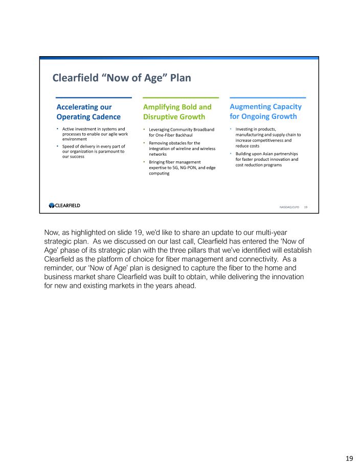 Legislation Supporting Broadband – What’s Known NA S DA Q : C LF D 18 Source: US Congress, Benton, JD Supra, Jeffries Research Estimated Broadband Infrastructure Subsidies based on Already Passed Legislation As I mentioned earlier, we are in the middle of a historic investment cycle for high - speed broadband, and fiber - led broadband in particular. On our previous quarterly call, we mentioned over 50% of Americans now work from home while just 15% of the p o p u l a t i o n d i d s o p ri o r t o C o v i d - 1 9 e p i d e m i c . T o g i v e e v e r y on e a s e n s e o f t h e enormous scale of this potential funding opportunity, slide 18 shows a chart put together by Jefferies Research that shows the anticipated increase in government funding over the next four years. This chart has been updated since last quarter because the expected funding amount has expanded. It’s also worth noting this chart does not include the infrastructure bills currently in discussion in Congress that are reported to add additional investments into our market, effectively doubling the value of the subsidies that are shown here. Clearfield is in a strong position to benefit from these incremental funding programs as they represent government dollars that will target the under - served and unserved community broadband markets that had been economically unviable for fiber investment, in addition to encouraging the broadband service providers to accelerate their rate of deployment in their existing footprint. Given the position Clearfield enjoys in the community broadband market, we believe this truly is a huge opportunity for Clearfield. 18