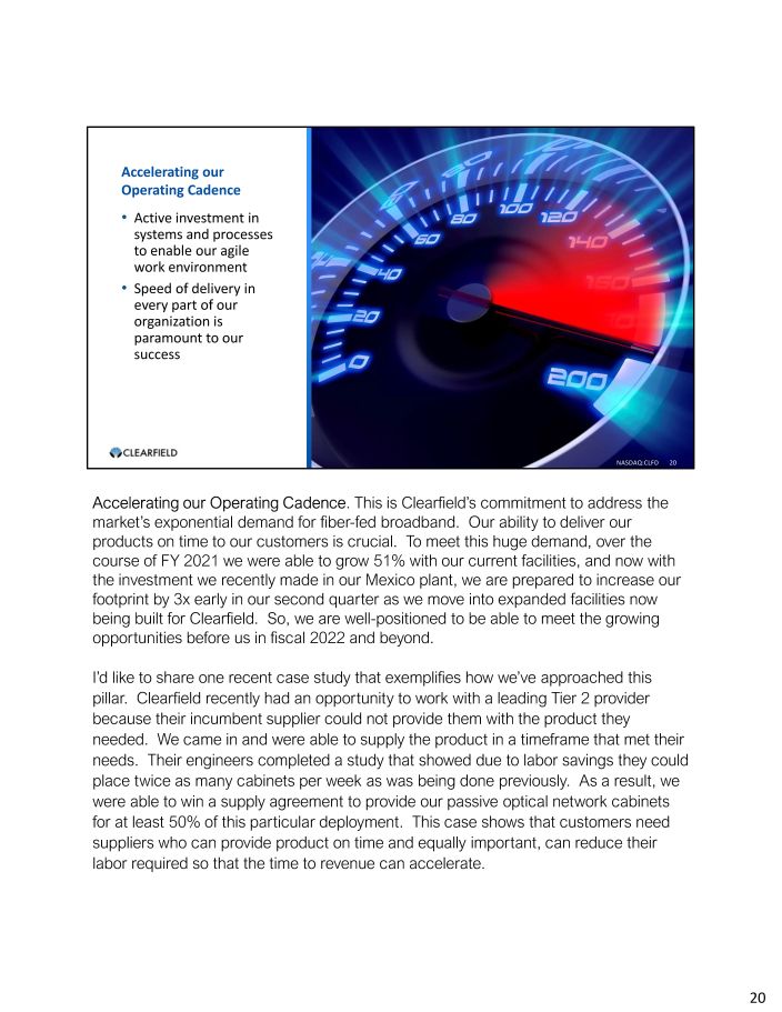 Clearfield “Now of Age” Plan NA S DA Q : C LF D 19 Augmenting Capacity for Ongoing Growth • Investing in products, m a nu f a c t ur i n g and s upply c hain t o increase competitiveness and reduce costs • Building upon Asian partnerships for faster product innovation and cost reduction programs Accelerating our Operating Cadence • Active investment in systems and processes to enable our agile work environment • Speed of delivery in every part of our organization is paramount to our success Amplifying Bold and Disruptive Growth • Leveraging Community Broadband for One - Fiber Backhaul • Removing obstacles for the integration of wireline and wireless networks • Bringing fiber management expertise to 5G, NG - PON, and edge computing Now, as highlighted on slide 19, we’d like to share an update to our multi - year strategic plan. As we discussed on our last call, Clearfield has entered the ‘Now of Age’ phase of its strategic plan with the three pillars that we’ve identified will establish Clearfield as the platform of choice for fiber management and connectivity. As a reminder, our ‘Now of Age’ plan is designed to capture the fiber to the home and business market share Clearfield was built to obtain, while delivering the innovation f o r n e w a n d e x i s t i n g m a r k e t s i n t h e y ea r s a h ea d . 19