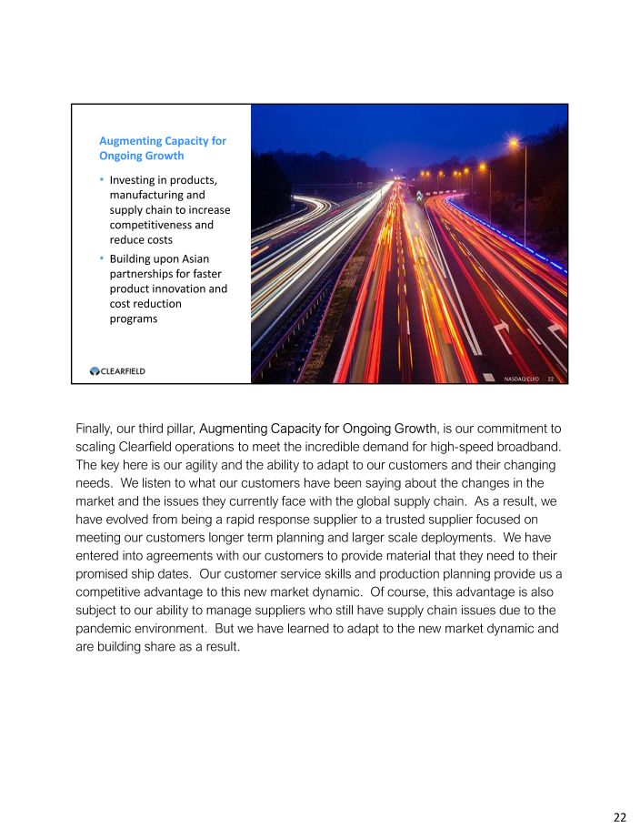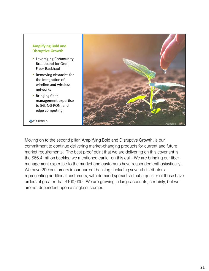 Accelerating our O p e r a ti ng C a d e n c e • Active investment in systems and processes to enable our agile work environment • Speed of delivery in every part of our organization is paramount to our success NA S DA Q : C LF D 20 Accelerating our Operating Cadence . This is Clearfield’s commitment to address the market’s exponential demand for fiber - fed broadband. Our ability to deliver our products on time to our customers is crucial. To meet this huge demand, over the course of FY 2021 we were able to grow 51% with our current facilities, and now with the investment we recently made in our Mexico plant, we are prepared to increase our footprint by 3x early in our second quarter as we move into expanded facilities now being built for Clearfield. So, we are well - positioned to be able to meet the growing o p p o r t u n i t i e s b e f o r e u s i n f i s c a l 202 2 a n d b e y o n d . I’d like to share one recent case study that exemplifies how we’ve approached this pillar. Clearfield recently had an opportunity to work with a leading Tier 2 provider because their incumbent supplier could not provide them with the product they n e e d e d . W e c a m e i n a n d w e r e a b l e t o s u pp l y t h e p r o d u c t i n a t i m e f r a m e t h a t m e t t h e i r needs. Their engineers completed a study that showed due to labor savings they could place twice as many cabinets per week as was being done previously. As a result, we were able to win a supply agreement to provide our passive optical network cabinets for at least 50% of this particular deployment. This case shows that customers need suppliers who can provide product on time and equally important, can reduce their labor required so that the time to revenue can accelerate. 20