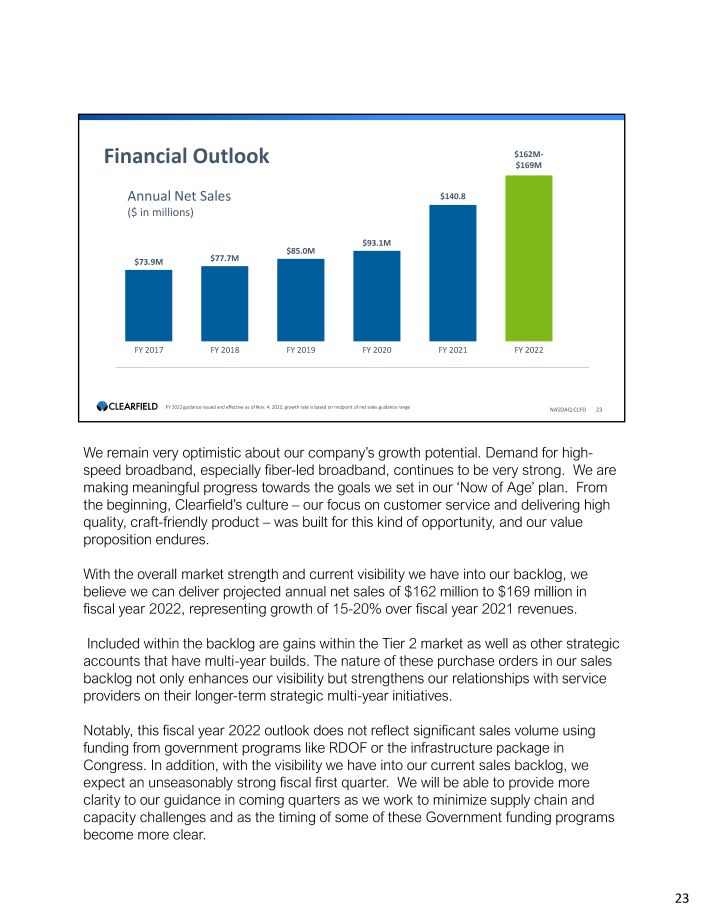 Augmenting Capacity for Ongoing Growth • Investing in products, manufacturing and supply chain to increase competitiveness and reduce costs • Building upon Asian partnerships for faster product innovation and cost reduction programs NA S DA Q : C LF D 22 Finally, our third pillar, Augmenting Capacity for Ongoing Growth , is our commitment to scaling Clearfield operations to meet the incredible demand for high - speed broadband. The key here is our agility and the ability to adapt to our customers and their changing needs. We listen to what our customers have been saying about the changes in the market and the issues they currently face with the global supply chain. As a result, we have evolved from being a rapid response supplier to a trusted supplier focused on meeting our customers longer term planning and larger scale deployments. We have entered into agreements with our customers to provide material that they need to their promised ship dates. Our customer service skills and production planning provide us a competitive advantage to this new market dynamic. Of course, this advantage is also subject to our ability to manage suppliers who still have supply chain issues due to the pandemic environment. But we have learned to adapt to the new market dynamic and are building share as a result. 22