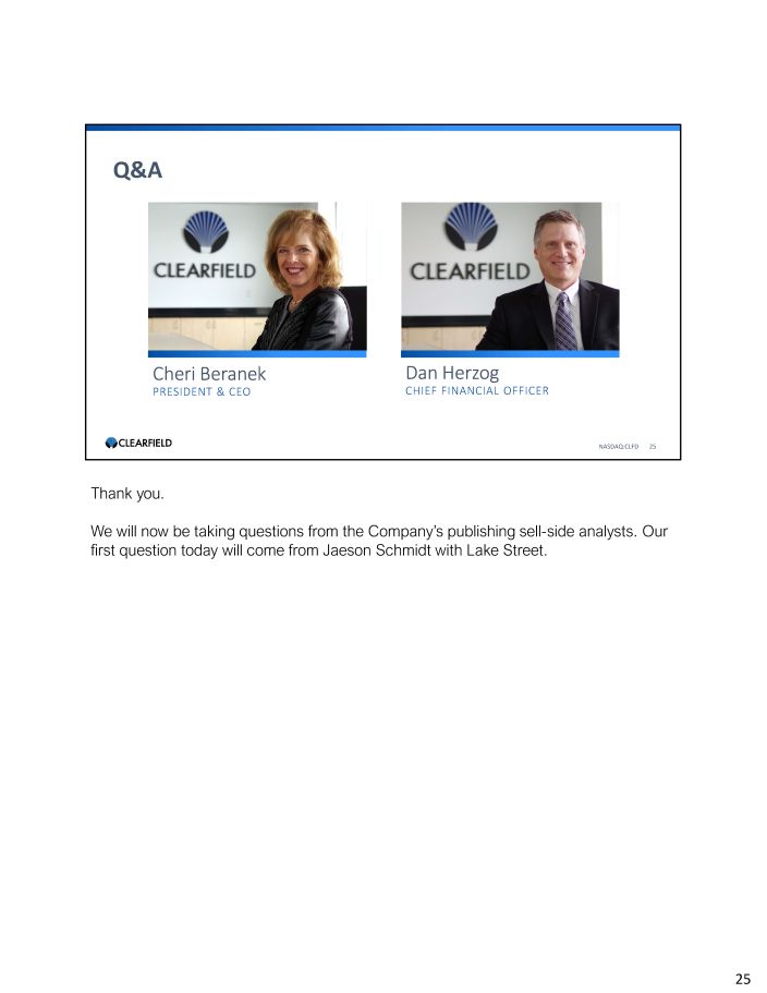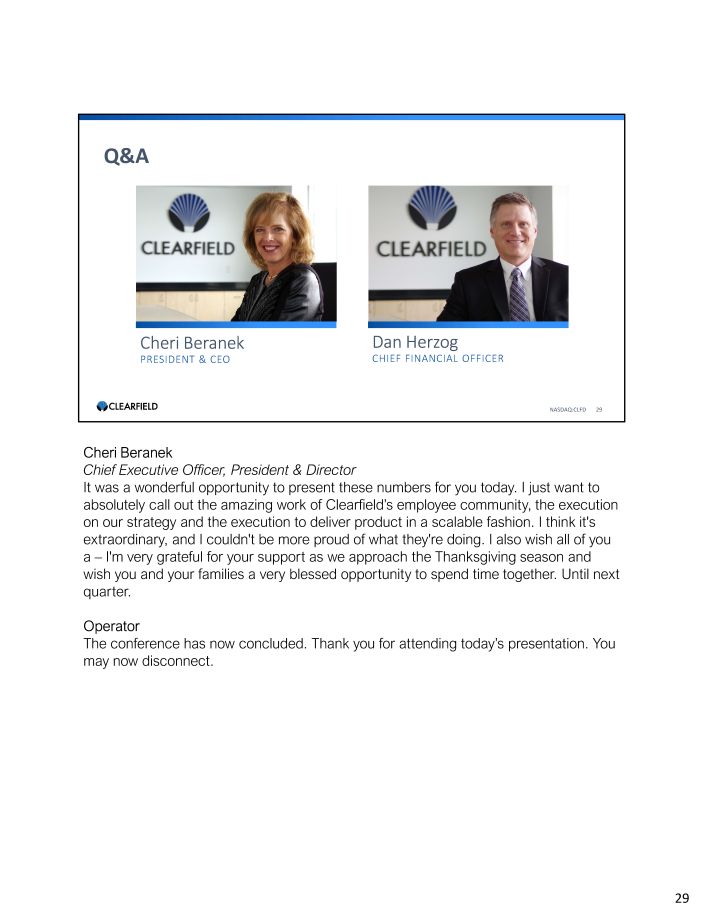 Q & A N A S DAQ:CLFD 2 8 C h e r i B e r a n e k PRESIDENT & CEO D a n H e r z o g CHIEF FINANCIAL OFFICER J a e s o n S c h m i d t L a k e S t r e e t C a p i t a l M a r k e t s , L L C , R e s ea r c h D i v i s i o n O k a y . T h a n k s a l o t g uy s . C h e ri B e r a n e k Chief Executive Officer, President & Director T h a n k y o u . G o o d t o t a l k t o y o u J a e s o n . Operator There being no questions at this time, this will conclude our question - and - answer session. If your question was not taken, you may contact Clearfield's investor relations team at clfd@gatewayir.com. I'd now like to turn the call back over to Ms. Beranek for any closing remarks. 28